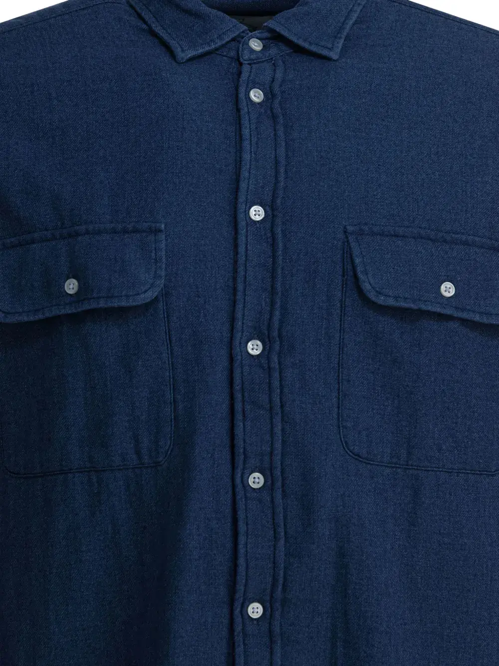 Синий, два нагрудных кармана, застегивается на пуговицы, длинные рукава, манжеты на пуговицах