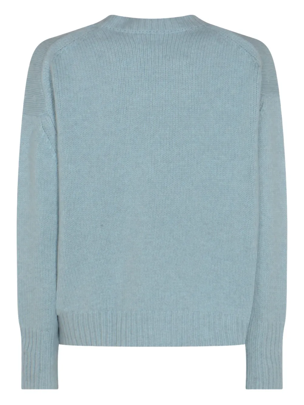 Светло-голубой в рубчик, вязаный, круглый вырез, длинные рукава, прямой низ, круглый воротник
