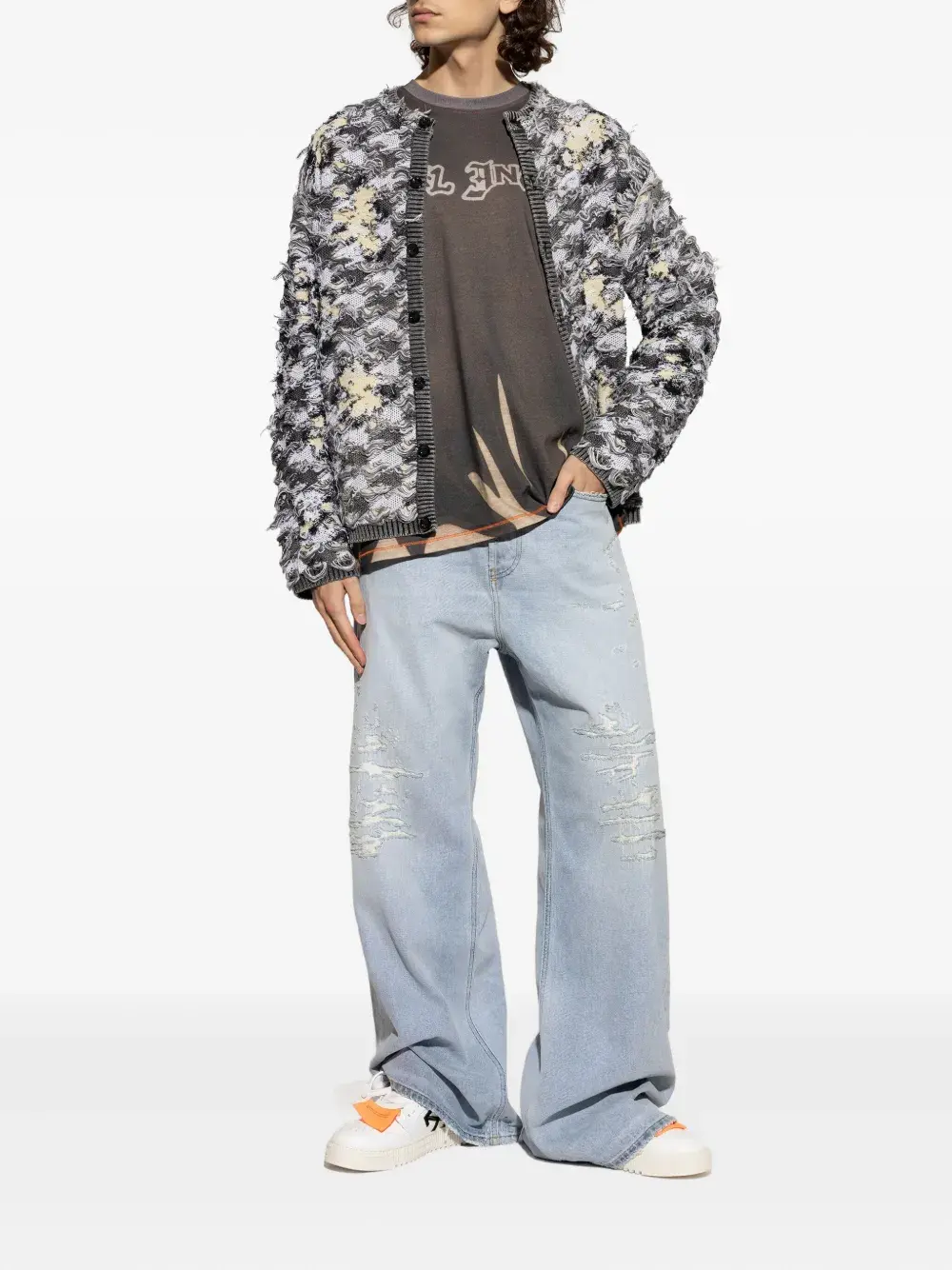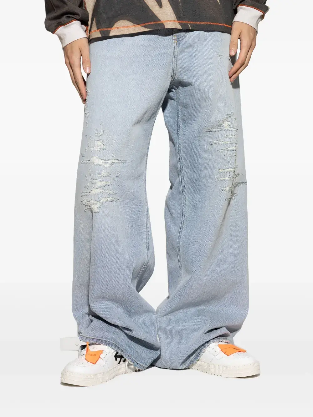 Светло-голубой с эффектом состаренности, пять карманов, шлевки для ремня, застежка на пуговицу