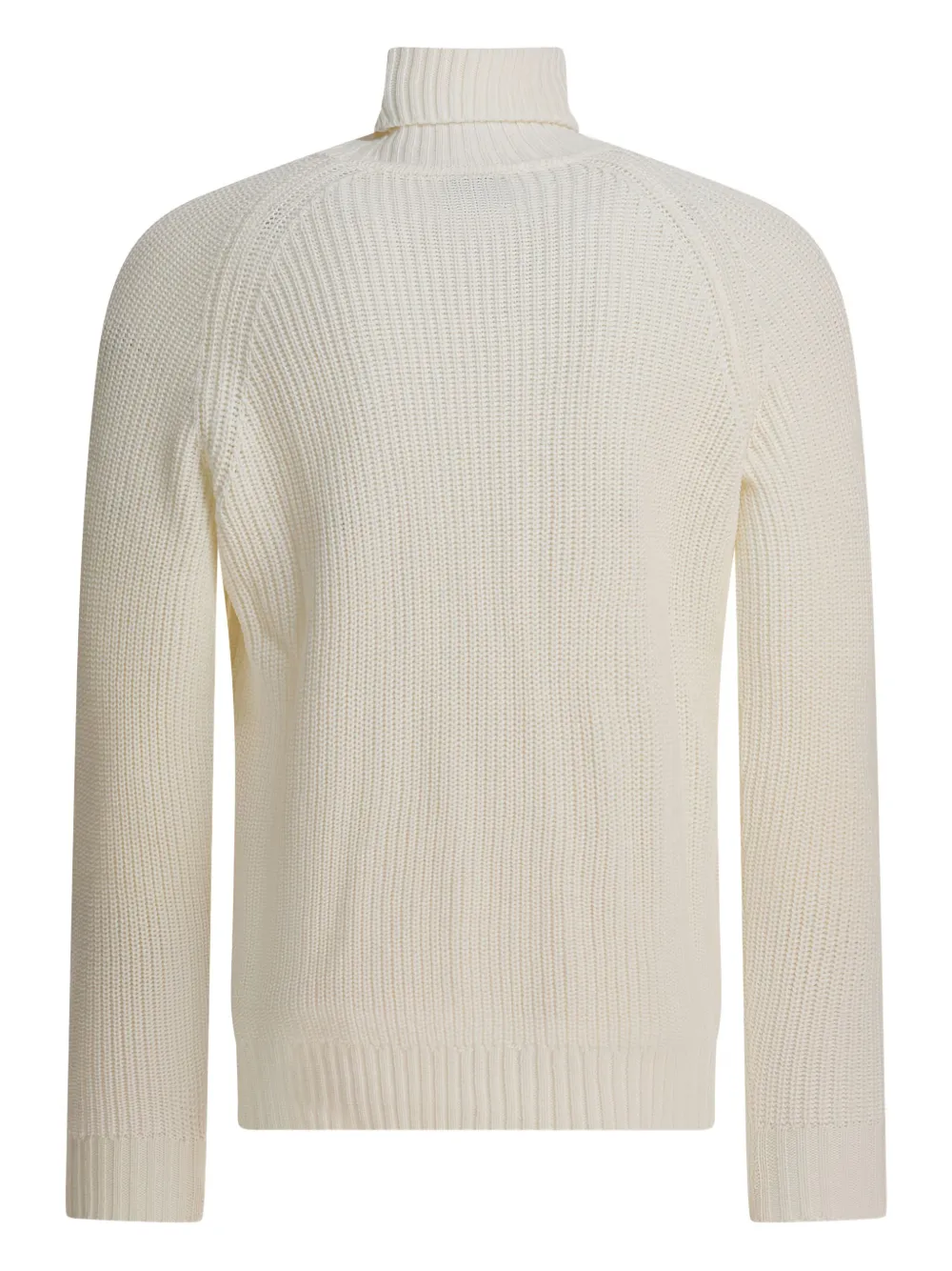 Слоново-косточный (оттенок айвори) рубчатый трикотаж, воротник-гольф, длинные рукава, прямой низ