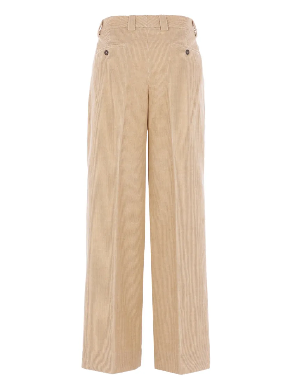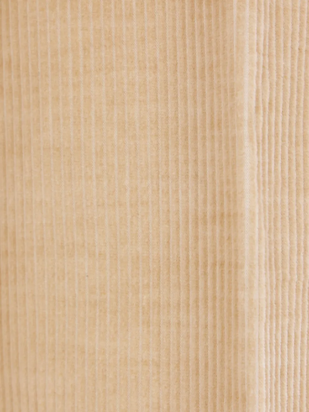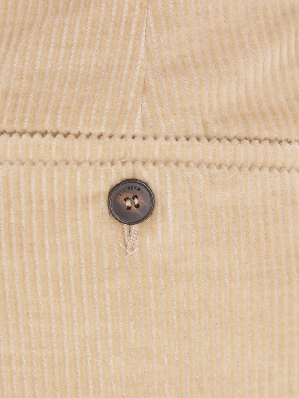 Светло-бежевый вельвет, текстура, застежка на пуговицы, шлевки для ремня, задний прорезной карман
