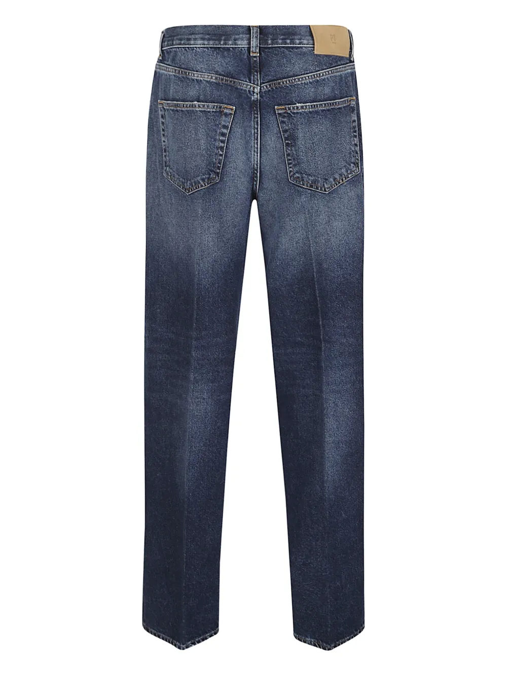 Синий хлопковый деним с эффектом потертости, пять карманов, шлевки для ремня, нашивка с логотипом