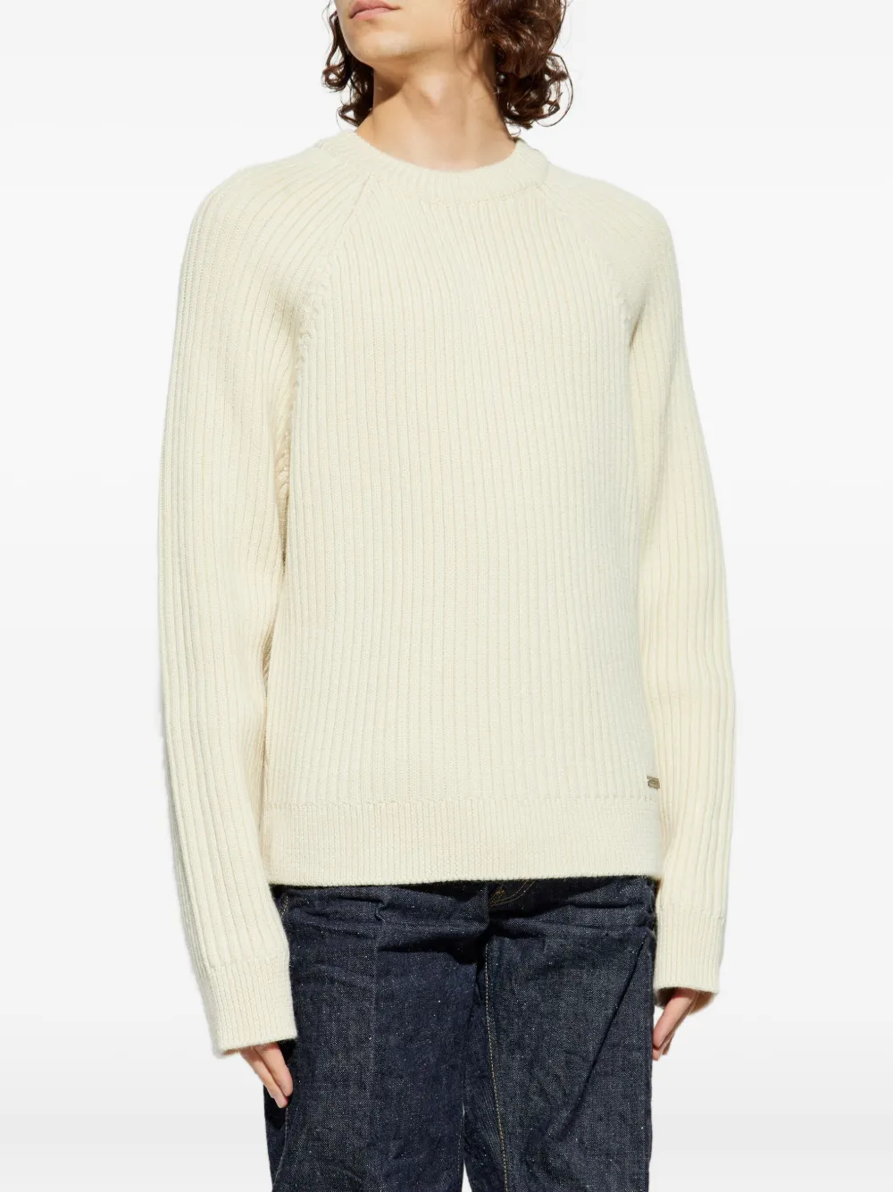 Бежевый джемпер в рубчик с круглым вырезом, длинными рукавами и металлической нашивкой с логотипом