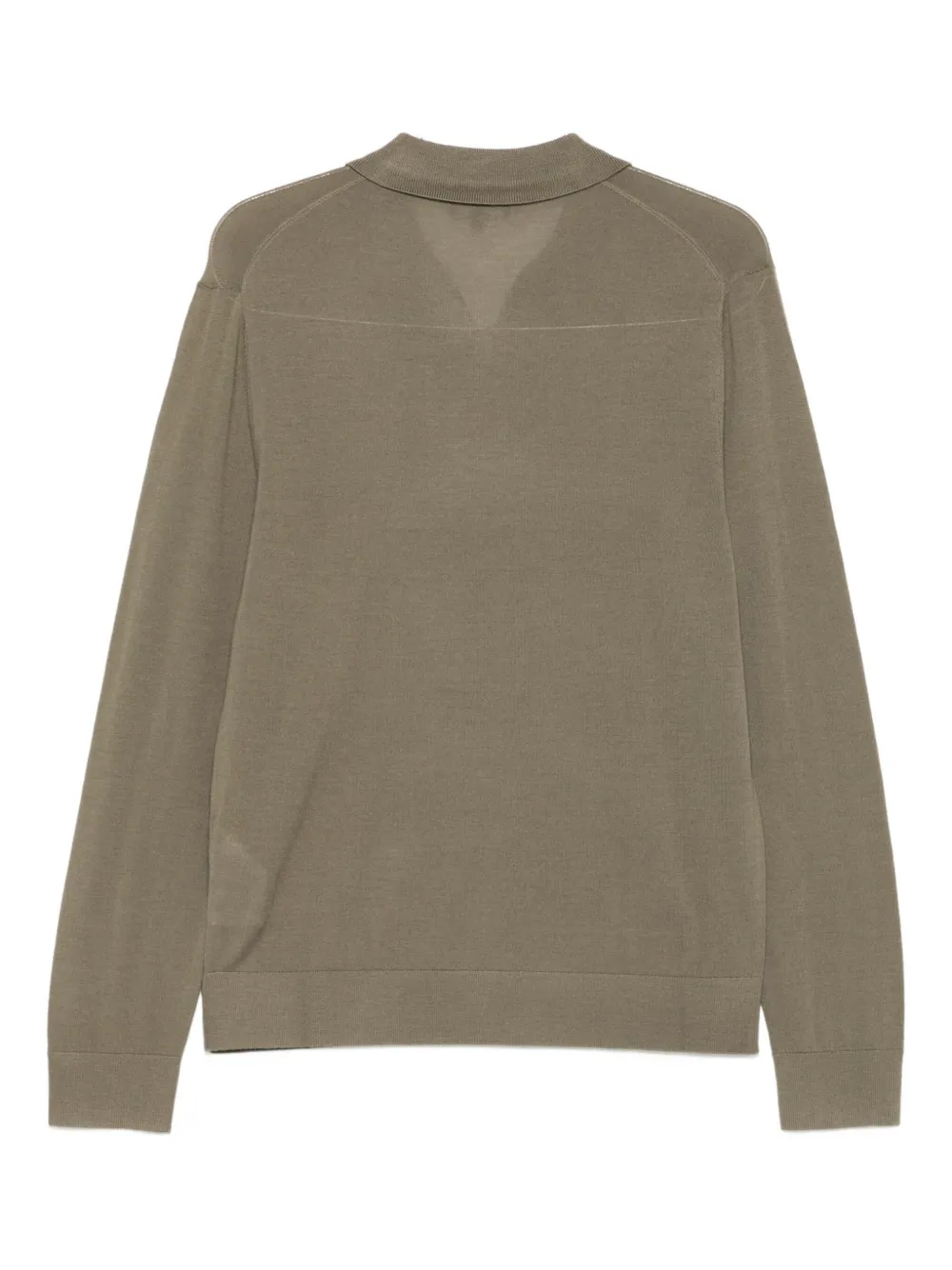 Оливково-зеленая рубашка-поло с воротником, длинными рукавами, тонкой строчкой и V-образным вырезом