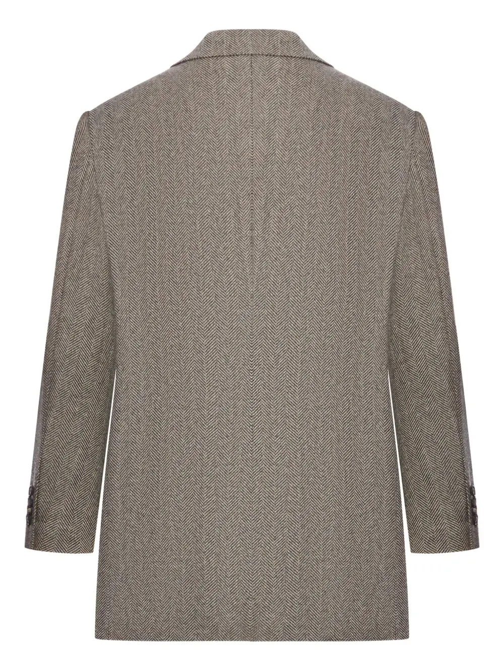 Коричневый цвет, елочка, карманы с клапанами, застежка на пуговицы, длинные рукава, лацканы с вырезом