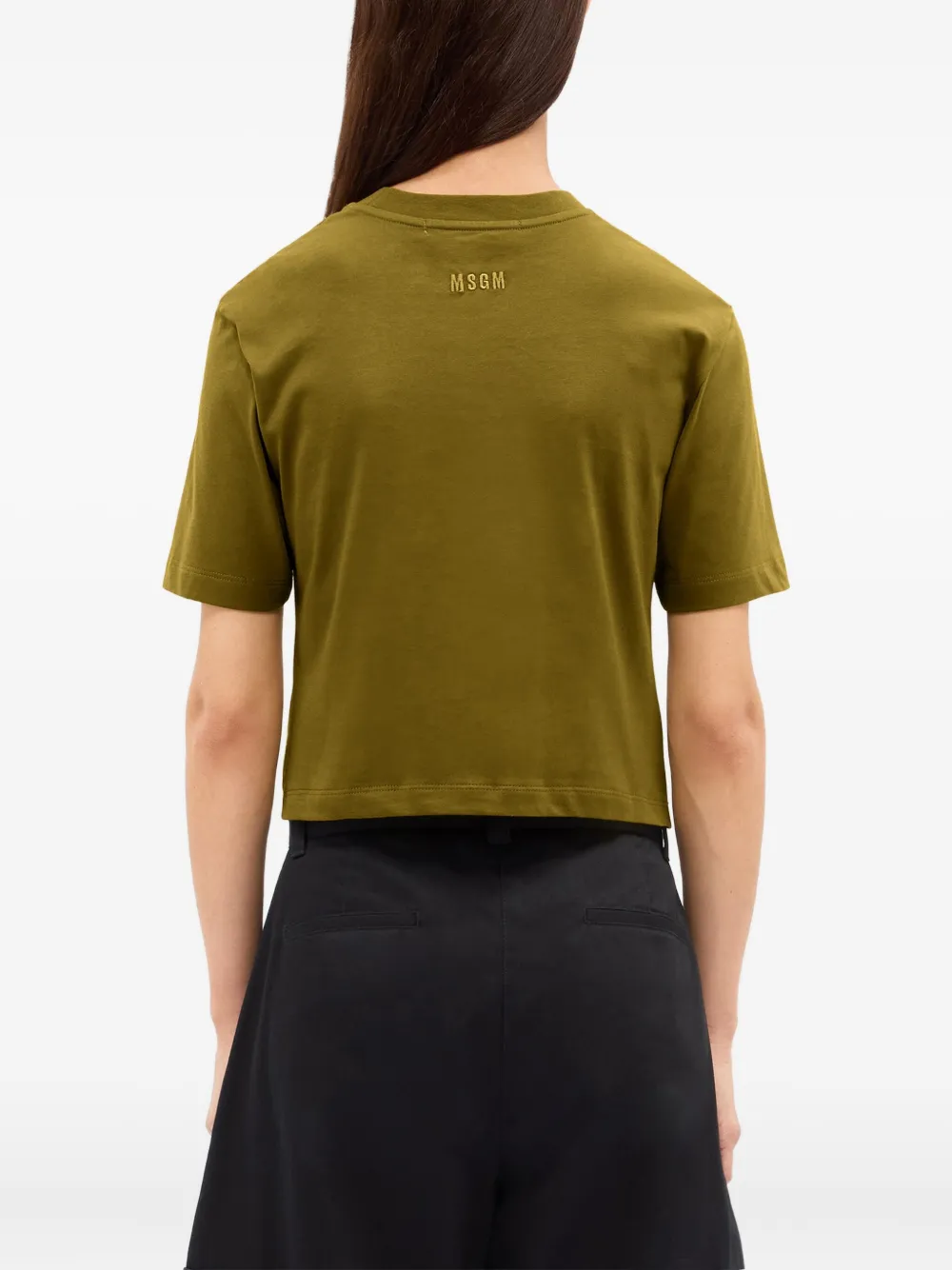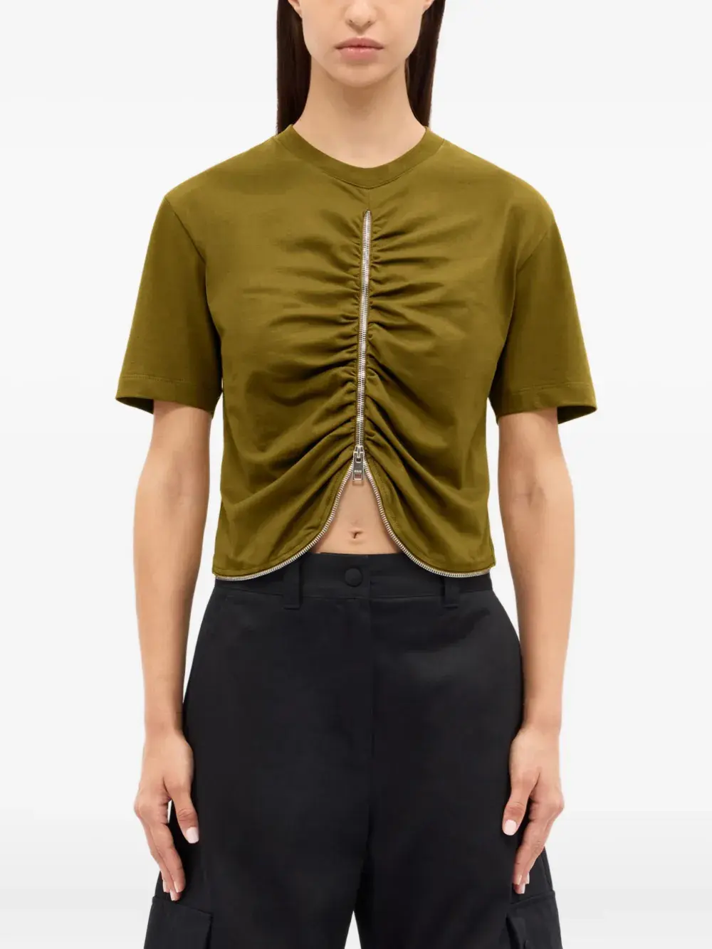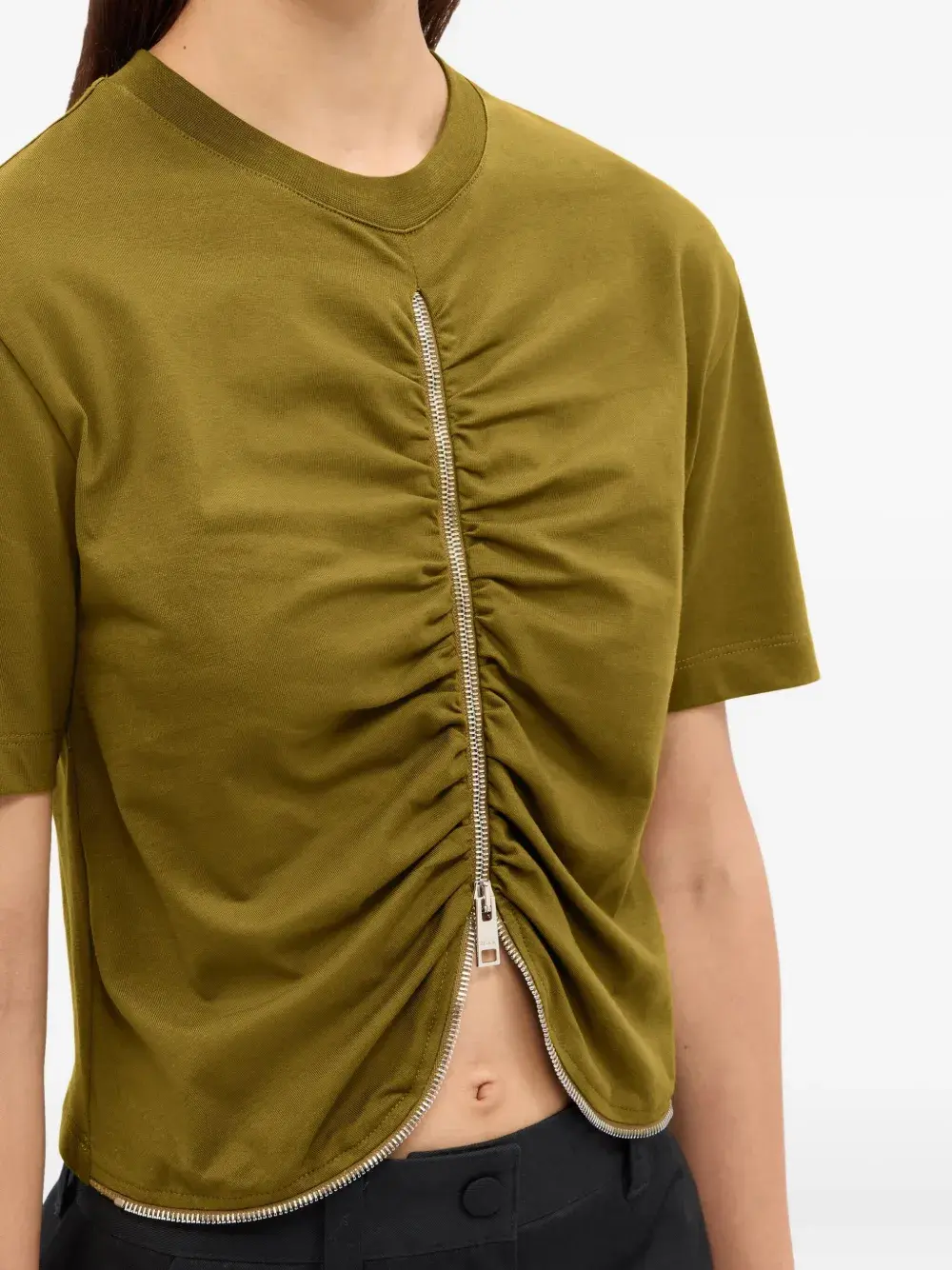 Оливково-зеленый цвет, сборка на ткани, застежка-молния, короткие рукава, круглый вырез, логотип сзади