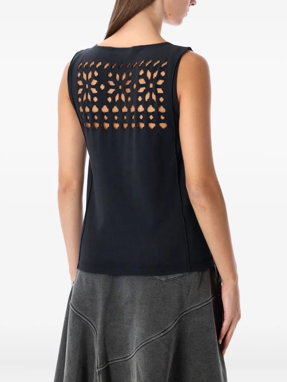 Черный топ без рукавов с круглым вырезом, открытой спиной, необработанным краем и панельной конструкцией