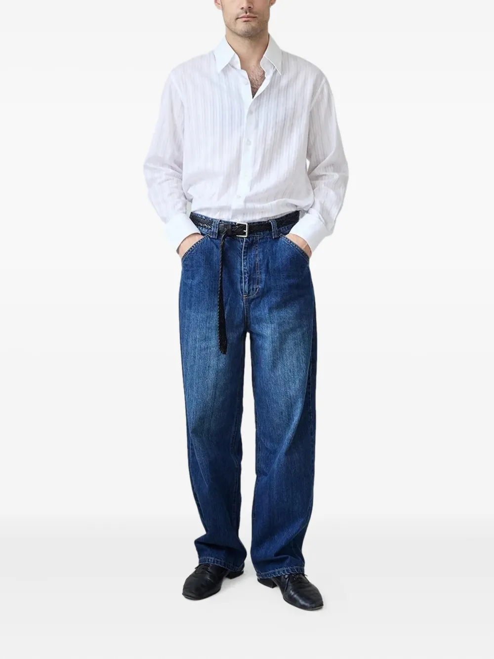 Белая рубашка с тональными полосками, застежкой на пуговицы, длинными рукавами и классическим воротником