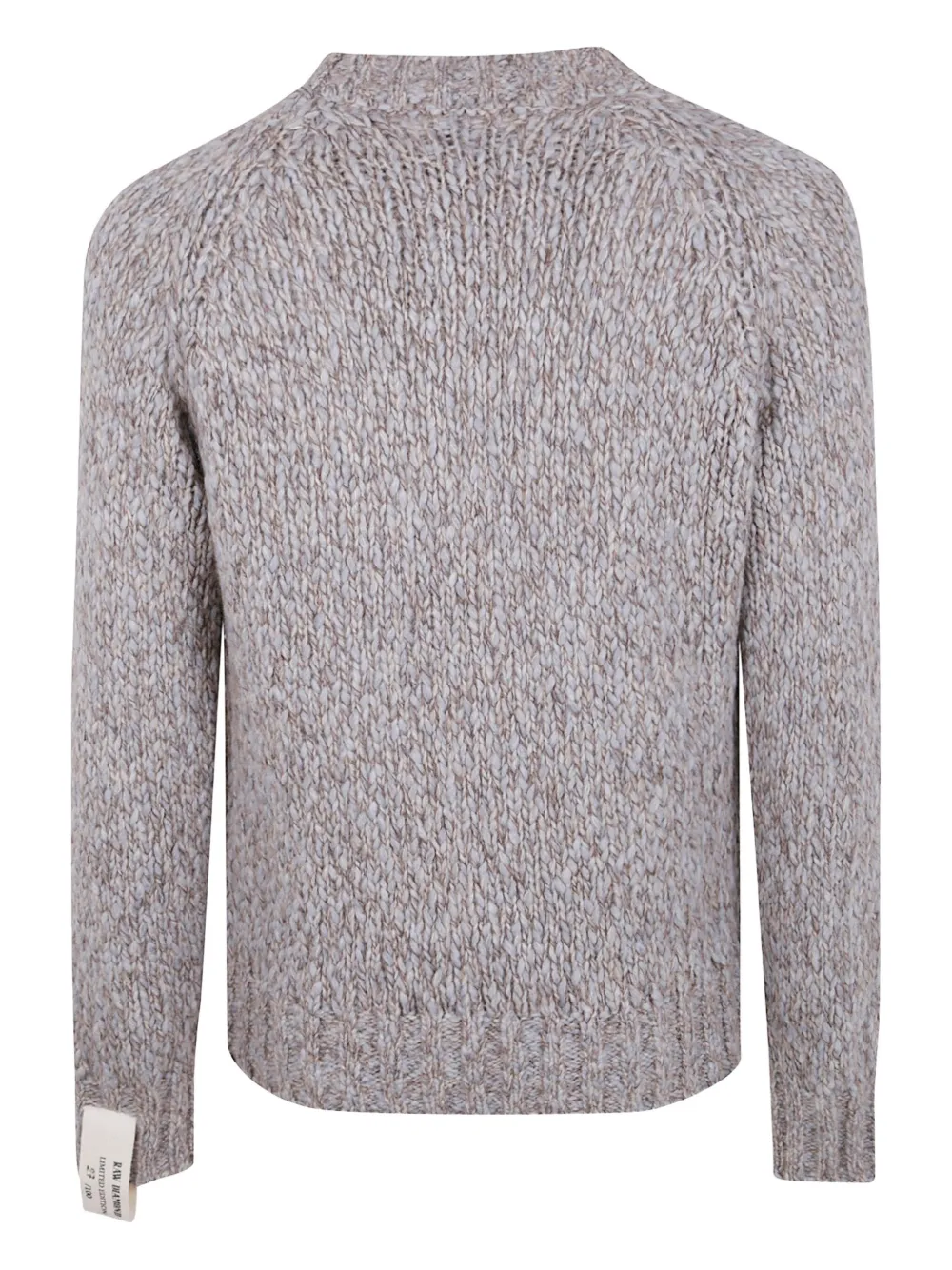 Серый, бежевый и коричневый цвета, вязаные рукава реглан, круглый вырез, ребристый низ, ребристые манжеты