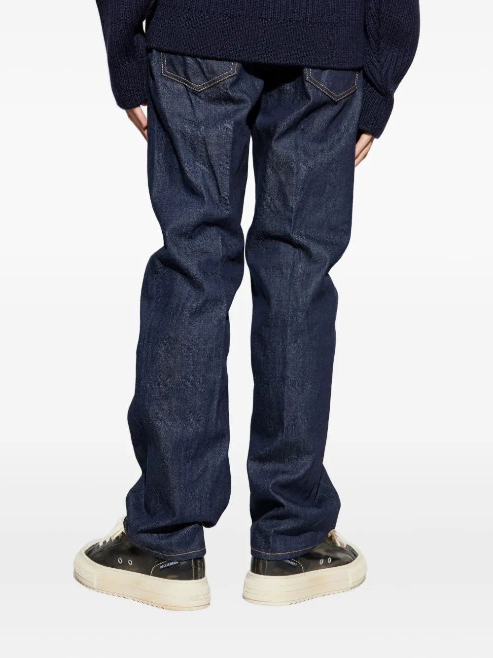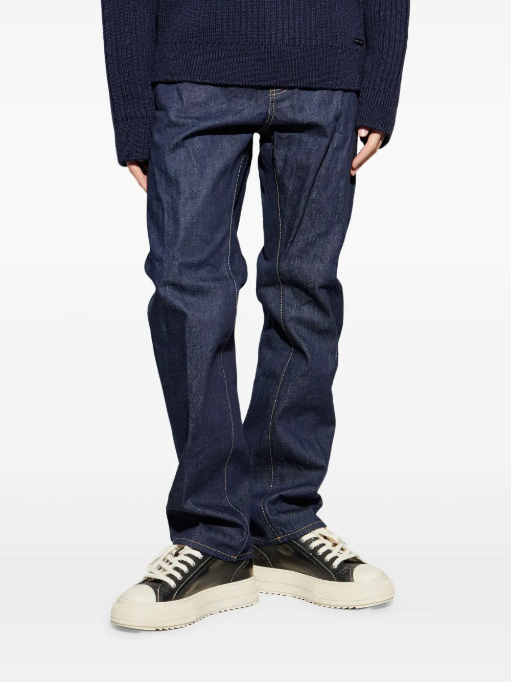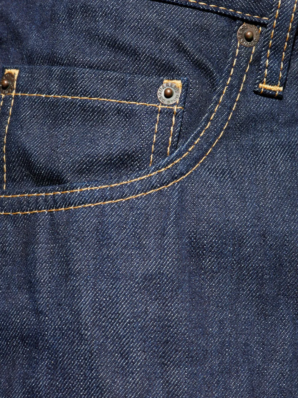 Темно-синяя отделочная строчка, пять карманов, шлевки для ремня, застежка на пуговицу, стандартная отделка