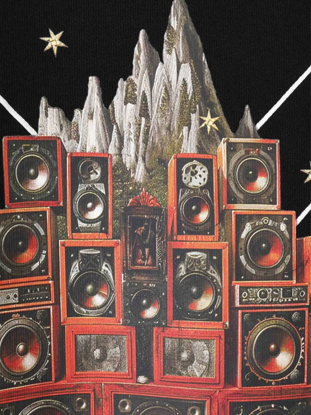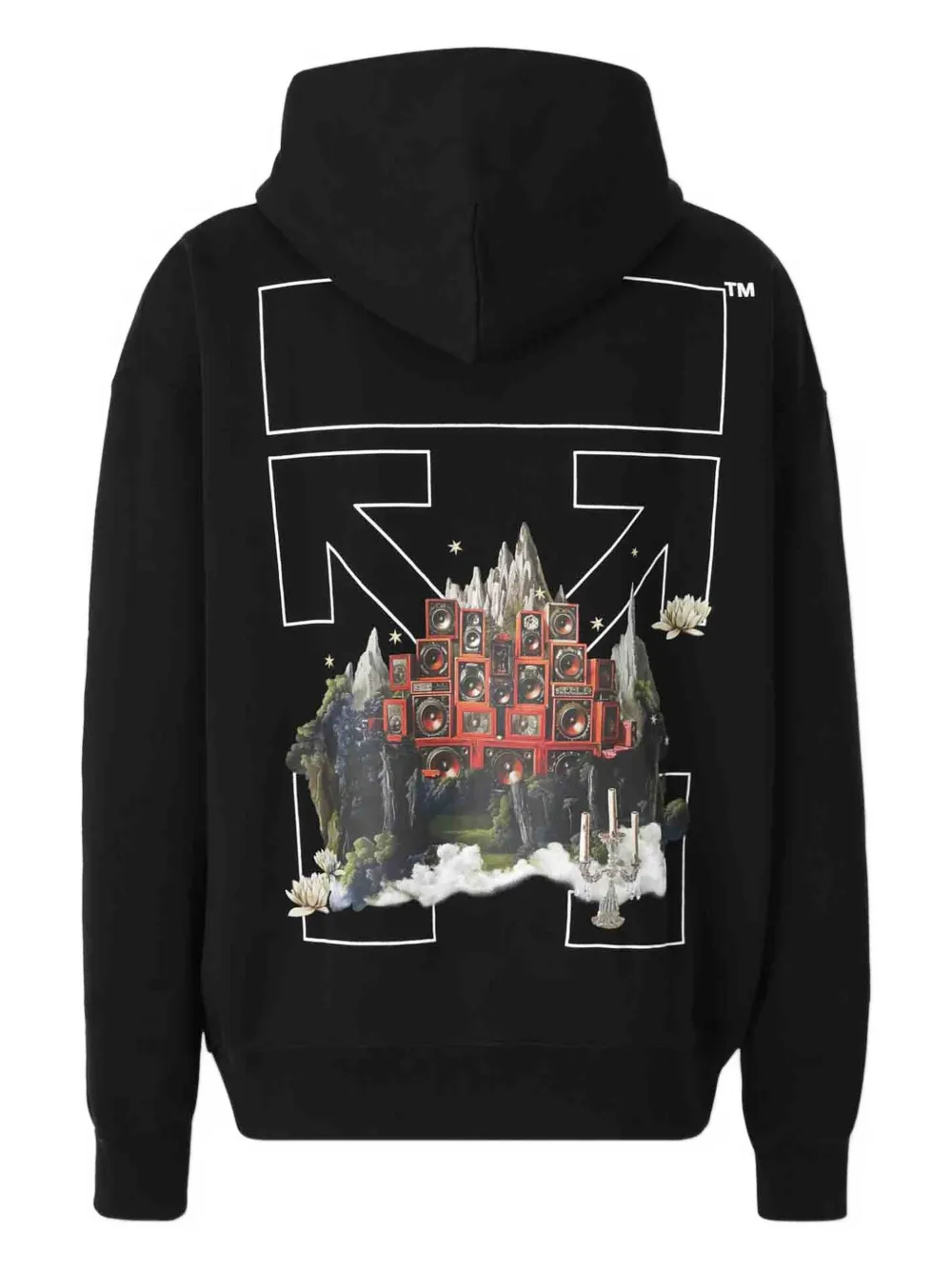 Черный худи с кулиской, графическим принтом, ребристыми манжетами и нижним краем, а также накладным карманом