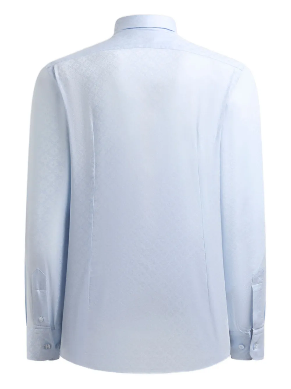 Светло-голубой жаккардовый узор, застежка на пуговицы, длинные рукава, манжеты на пуговицах, отложной воротник