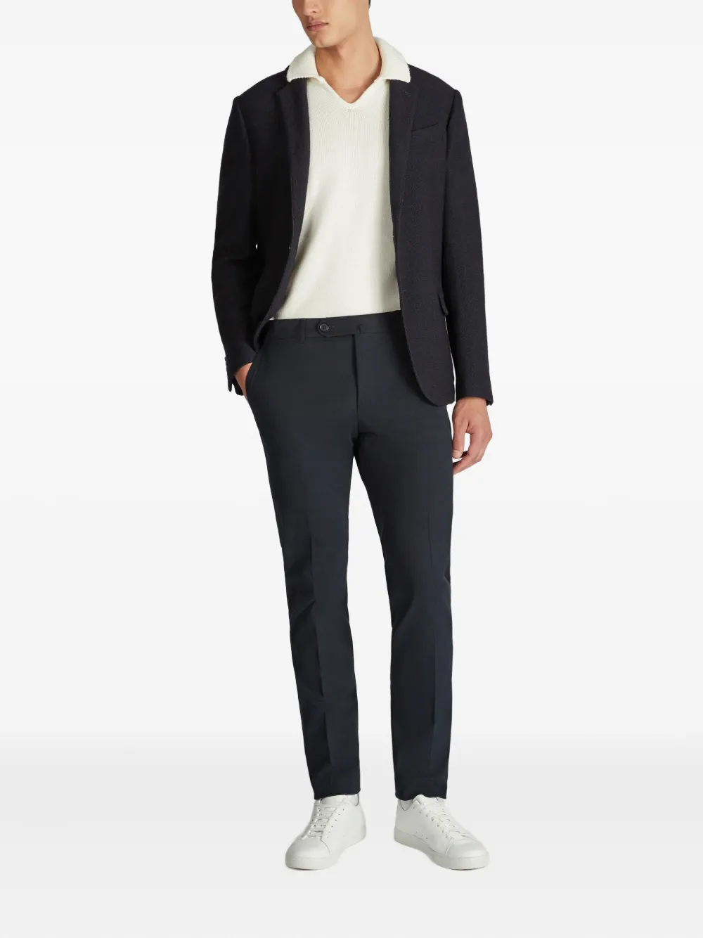 Темно-синяя шерсть мериноса, застежка на пуговицы спереди, однобортный крой, клапанные карманы, длинные рукава