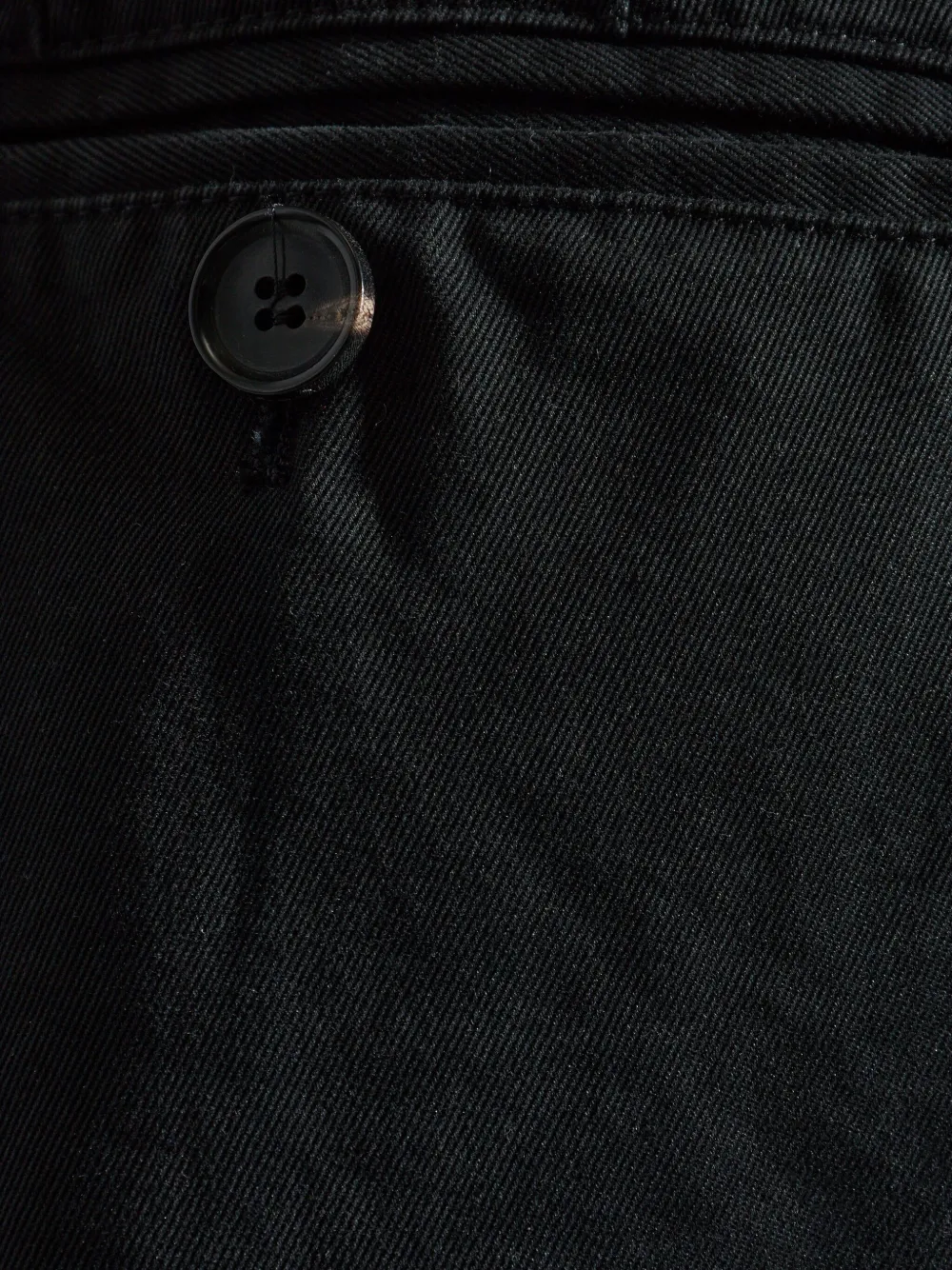 Черные, застежка на пуговицу, шлевки для ремня, боковые карманы в шве, задний прорезной карман, тональная строчка
