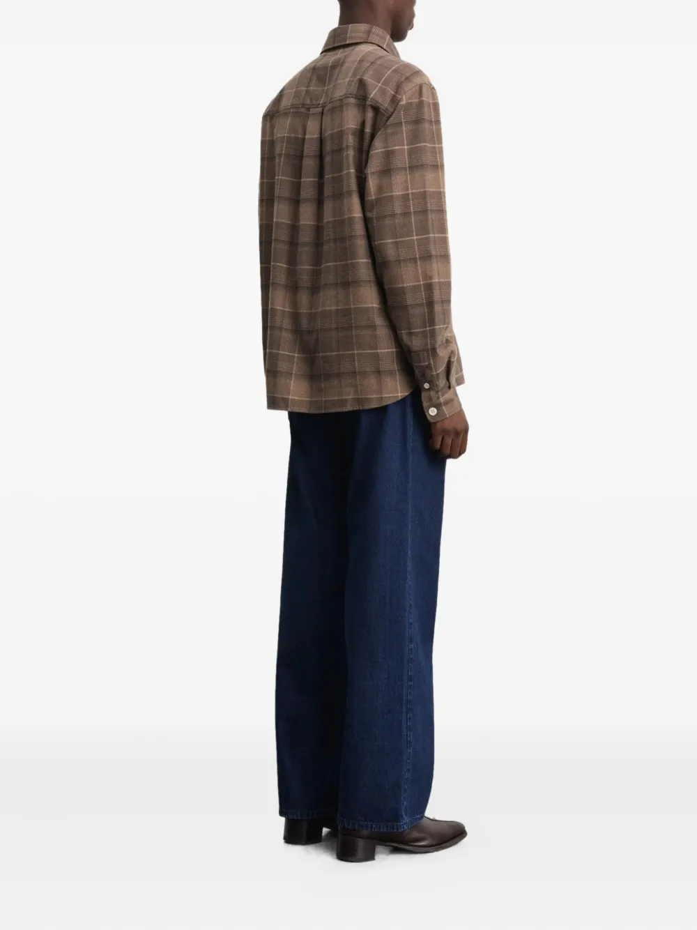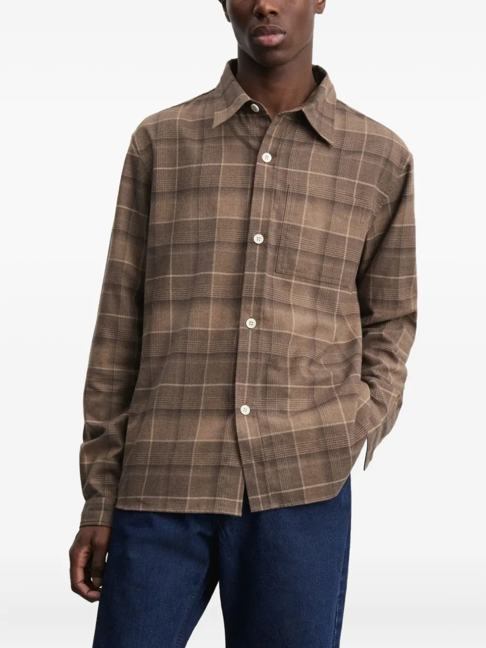 Светло-коричневый в клетку, накладной карман на груди, застежка на пуговицы, длинные рукава, манжеты на пуговицах