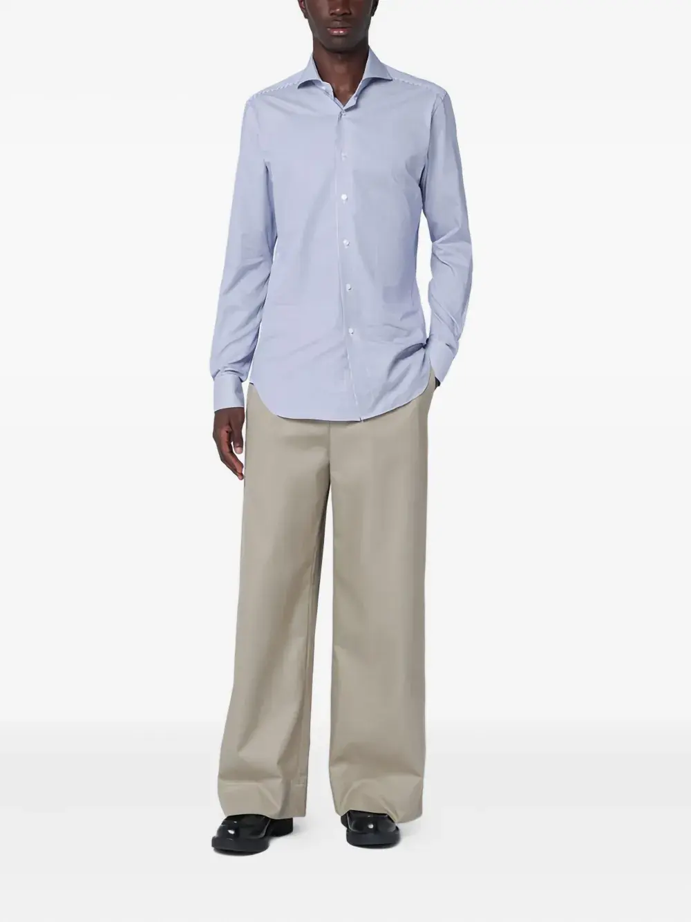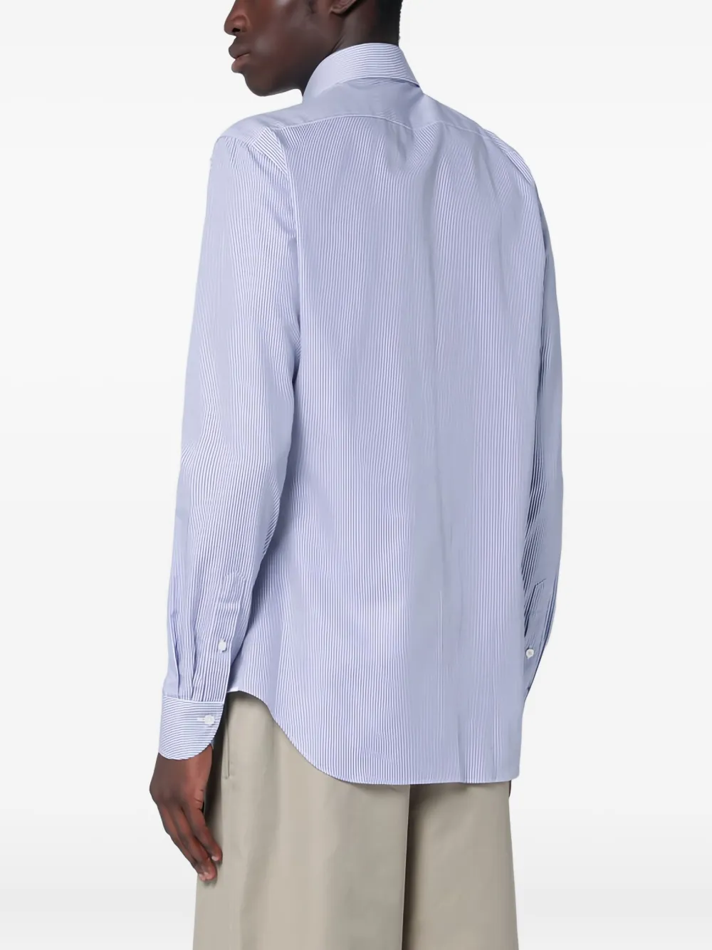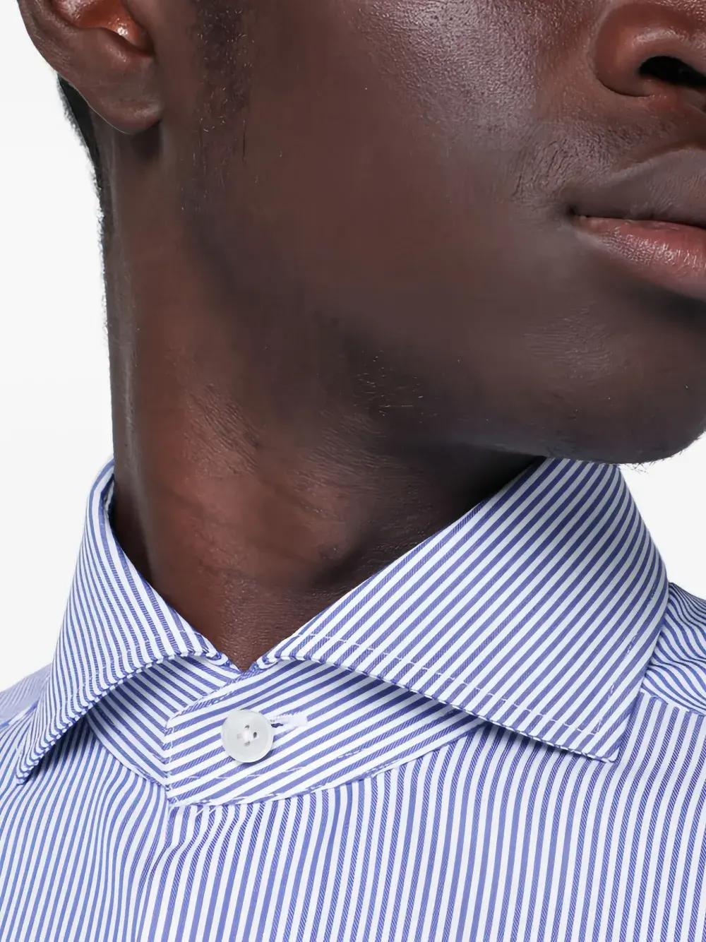 Белая и синяя полосатая рубашка с длинными рукавами, застегивающимися на пуговицы манжетами и классическим воротником