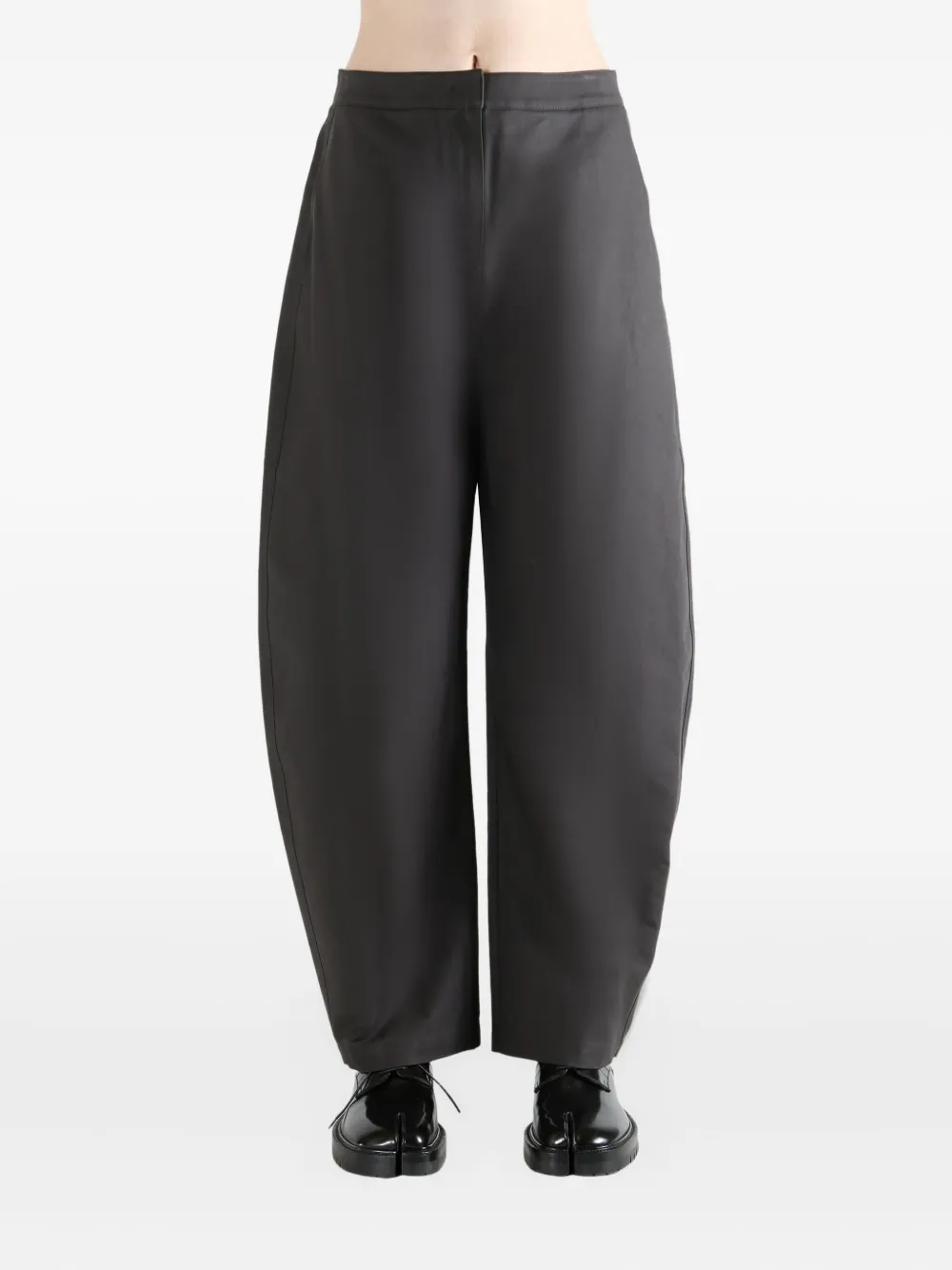Угольно-серый хлопок, боковые карманы в швах, задние прорезные карманы, потайная застежка спереди, широкий крой брючин