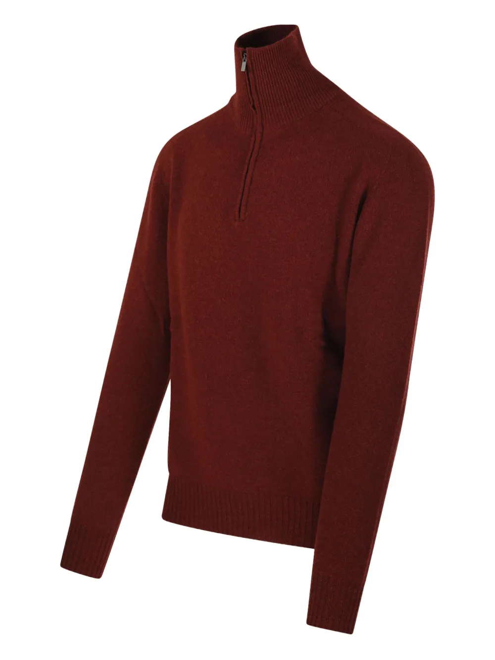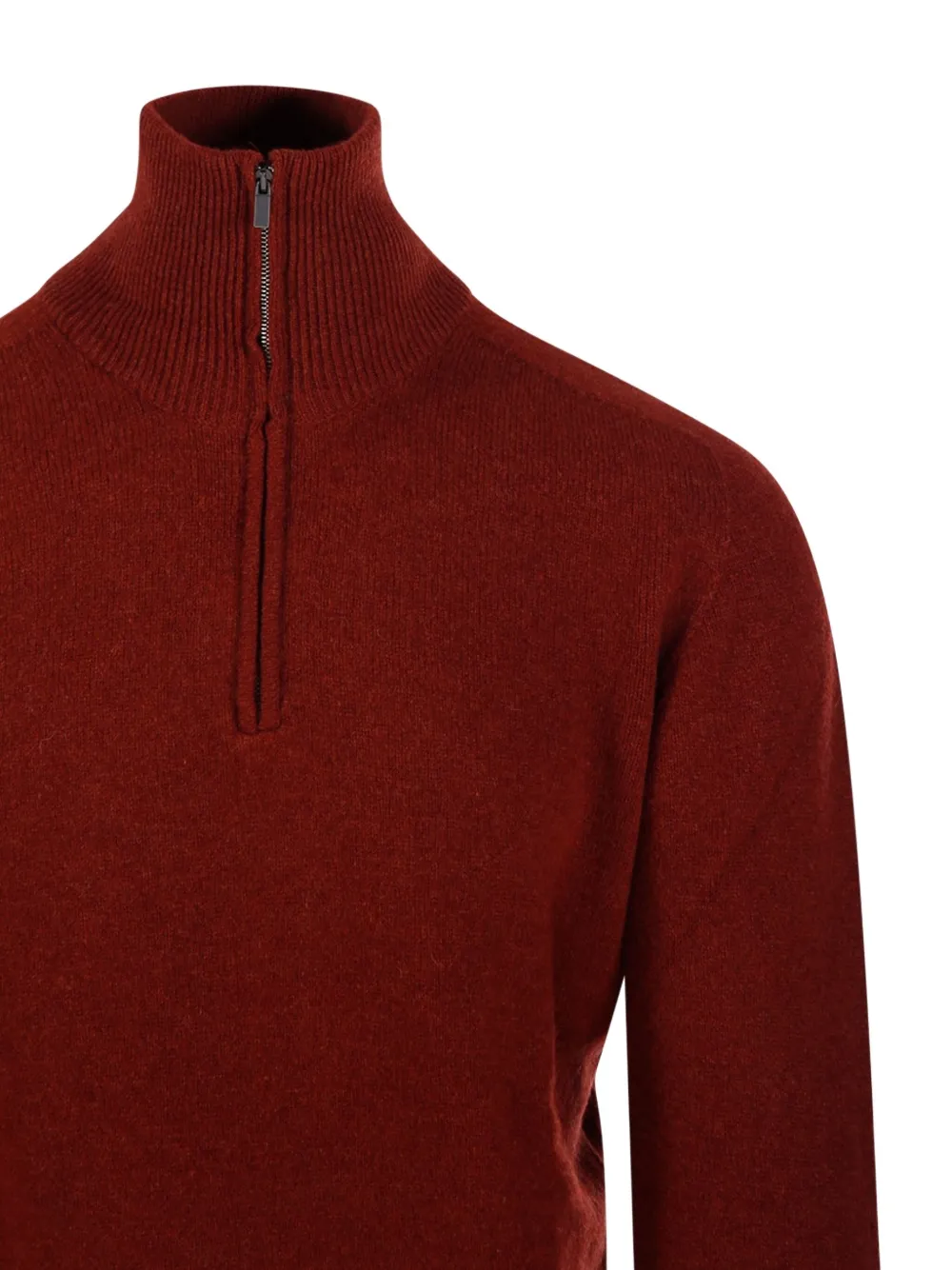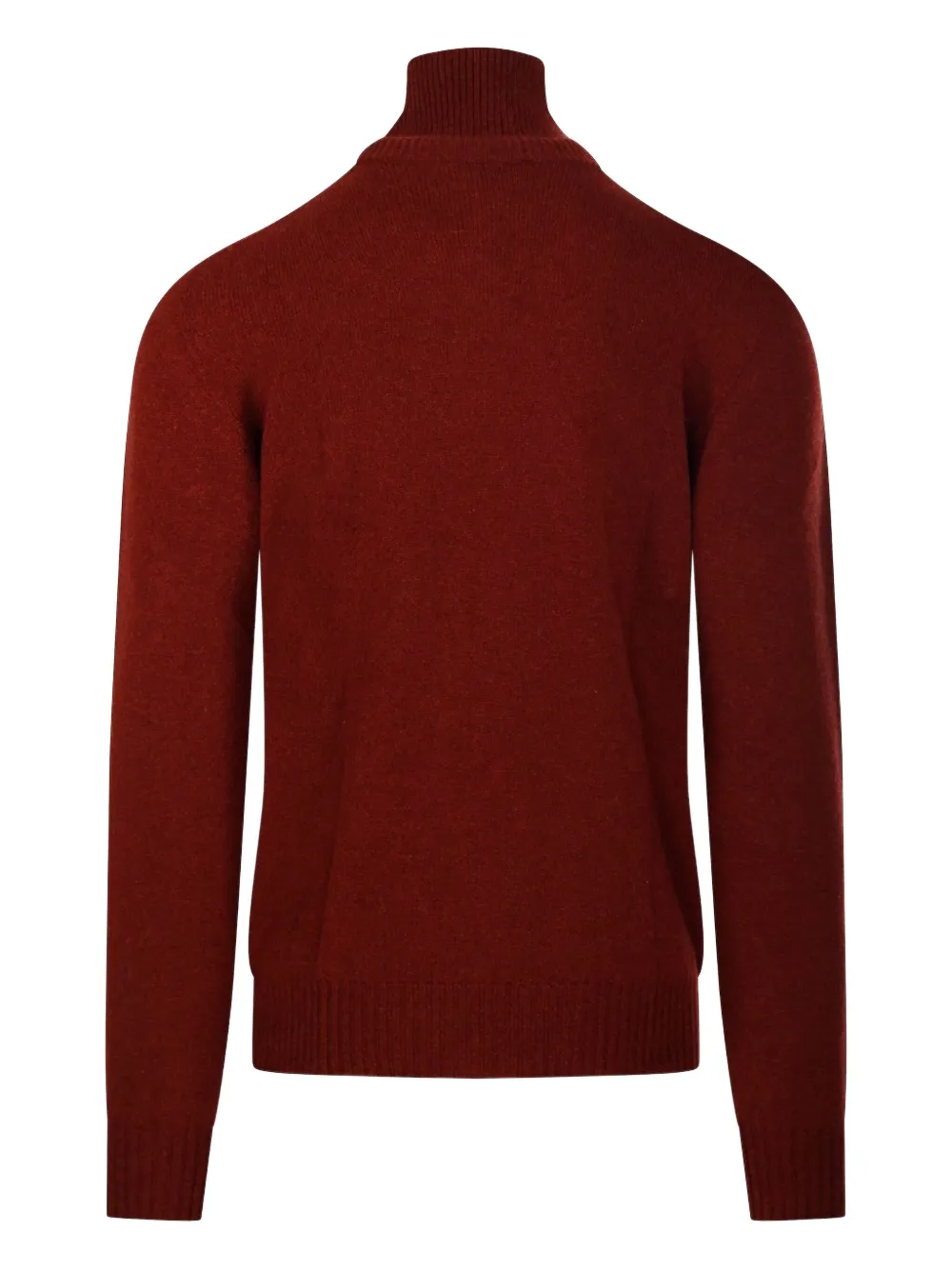 Красный свитер с высоким воротом, застежкой на половину длины молнии, ребристыми манжетами и подолом, длинными рукавами