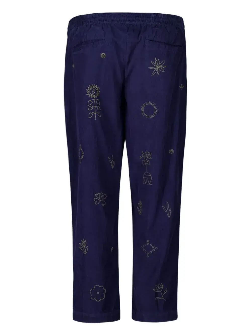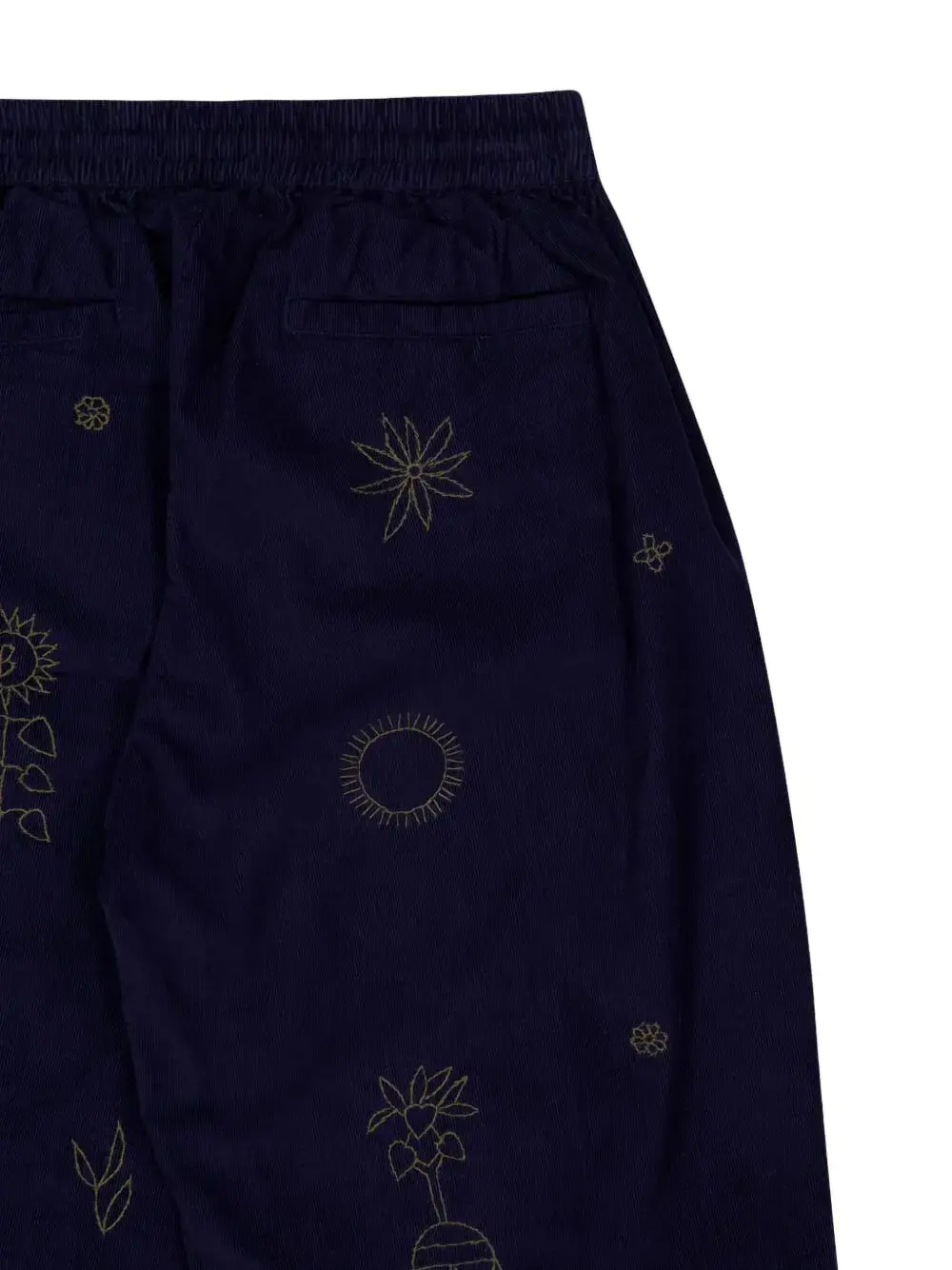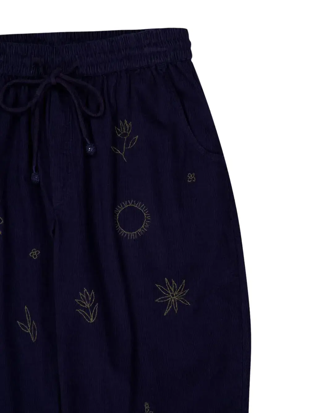 Темно-синие, вышитые детали, застежка на шнурке, эластичный пояс, боковые закругленные карманы, задние прорезные карманы