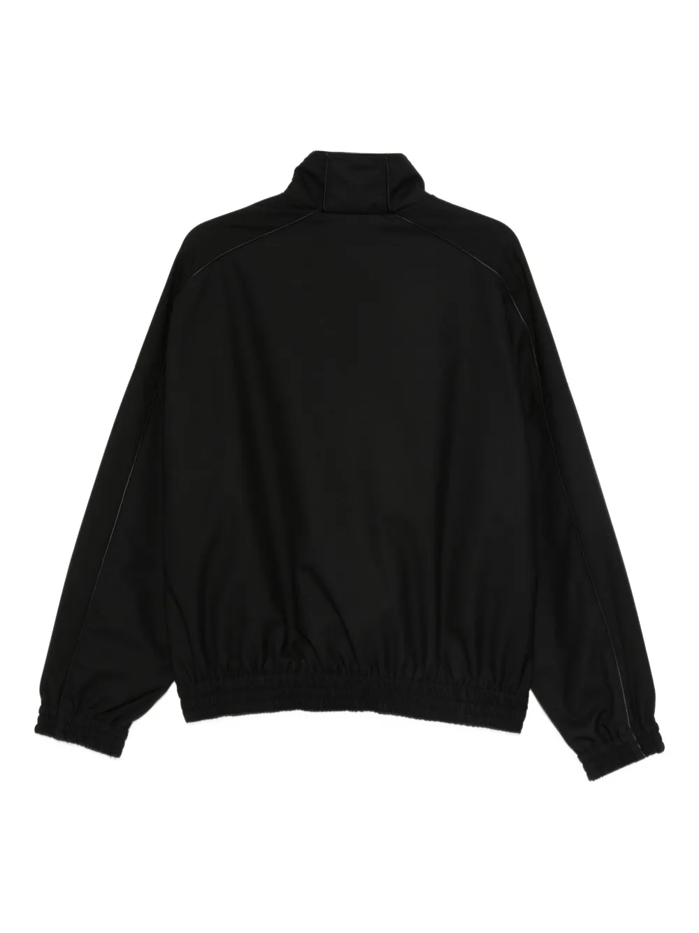 Черная куртка с застежкой-молнией, высоким воротником, длинными рукавами, декоративными швами и боковыми карманами на молнии