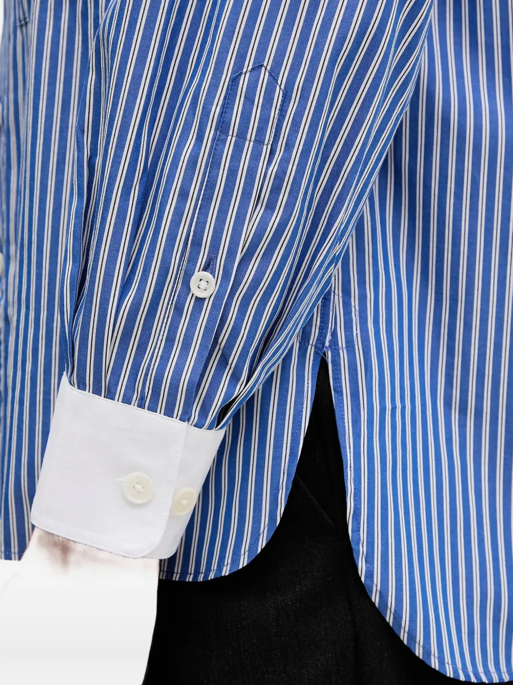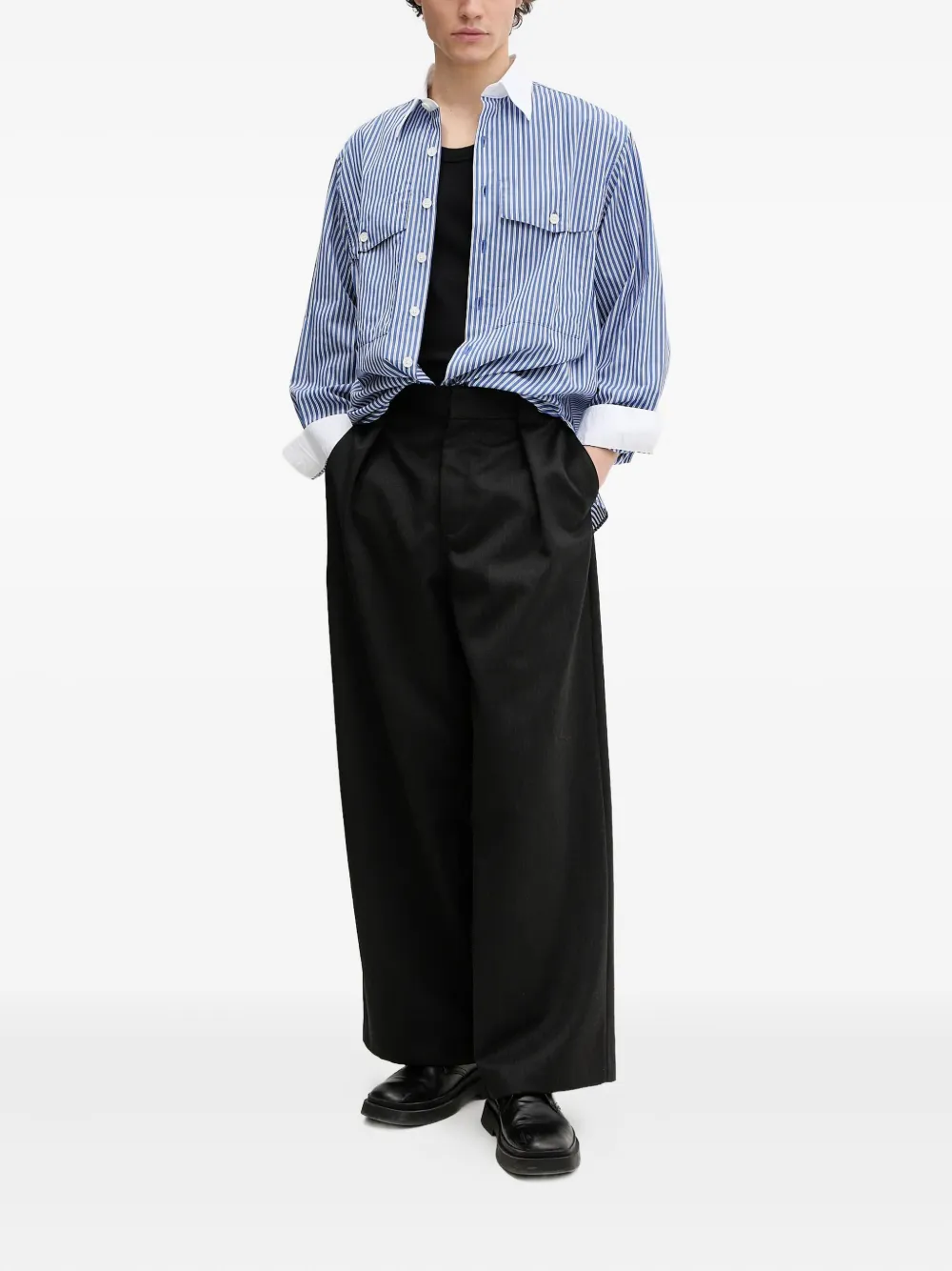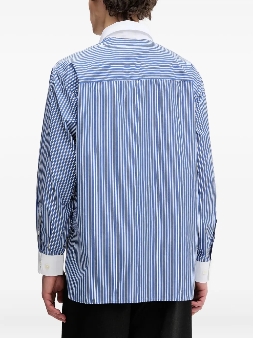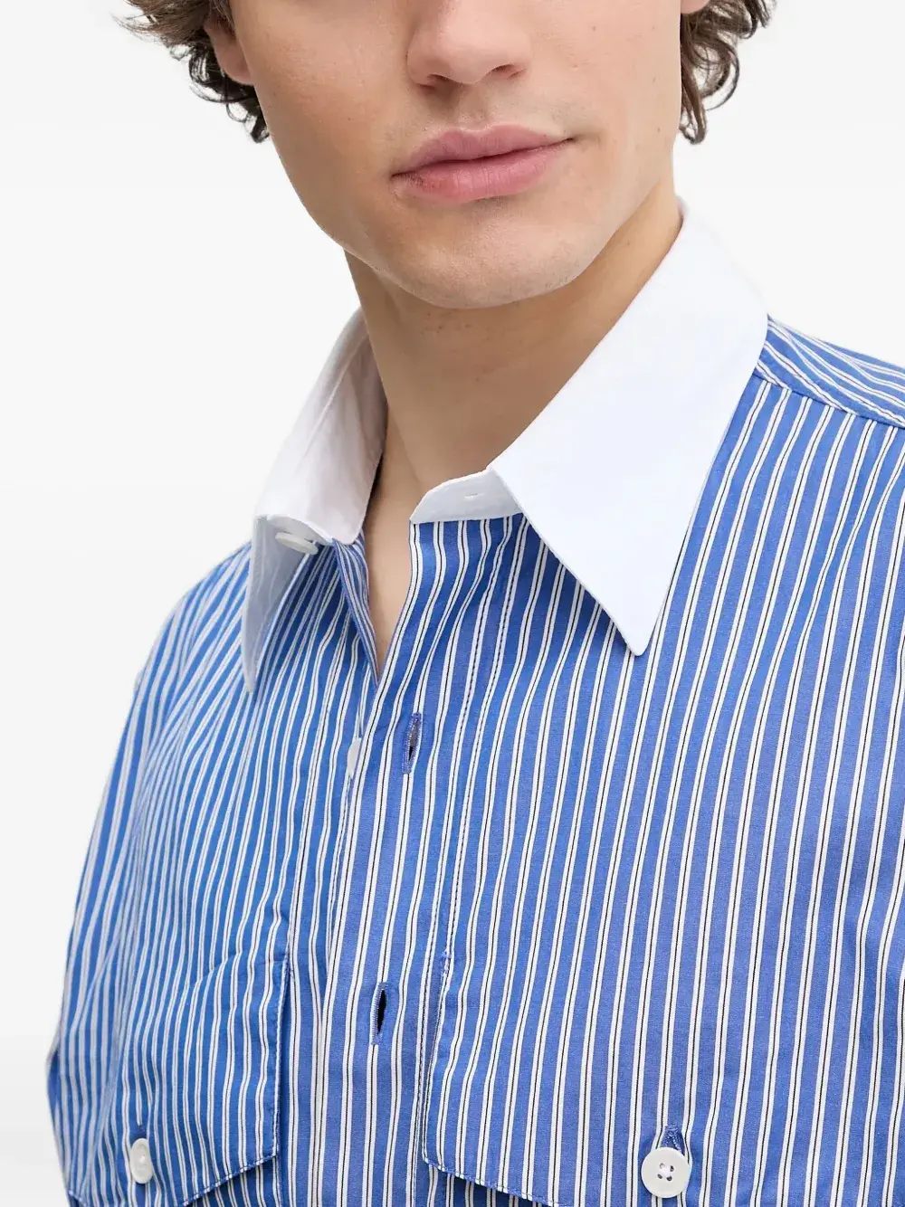 Синий полосатый узор, заостренный воротник, застежка на пуговицы спереди, нагрудные карманы с клапанами, манжеты на пуговицах
