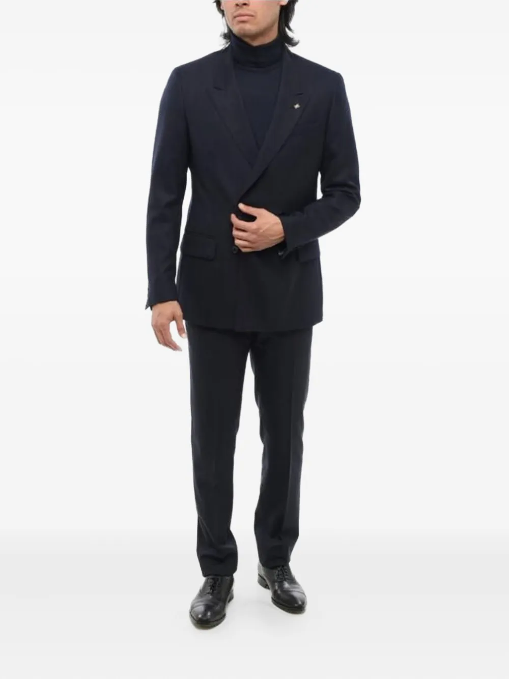 Темно-синяя булавка на лацкане, двубортная застежка на пуговицы, прорезные карманы с клапанами, манжеты с четырьмя пуговицами