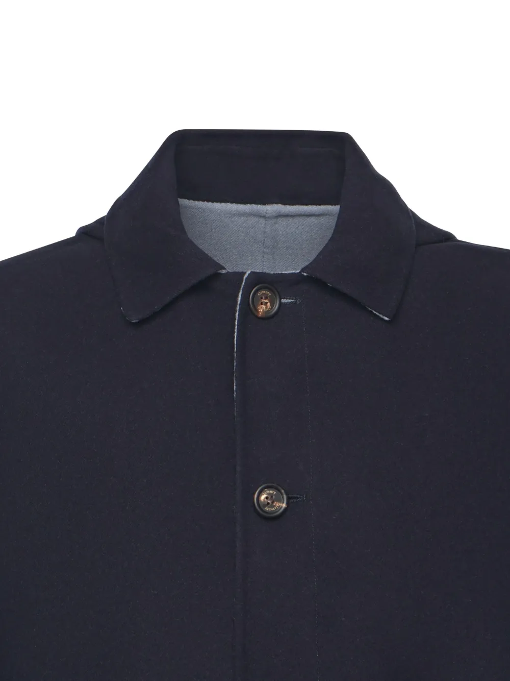 Синий цвет, застежка на пуговицы, воротник-спрэд, накладные карманы спереди с клапанами, длинные рукава, манжеты на пуговицах