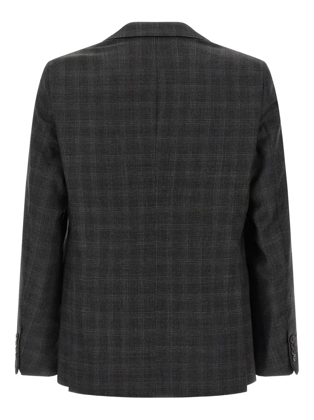 Серый принт "Принц Уэльский", съемная металлическая брошь, клапаны на карманах, разрезы сзади, застежка на молнию и пуговицу спереди