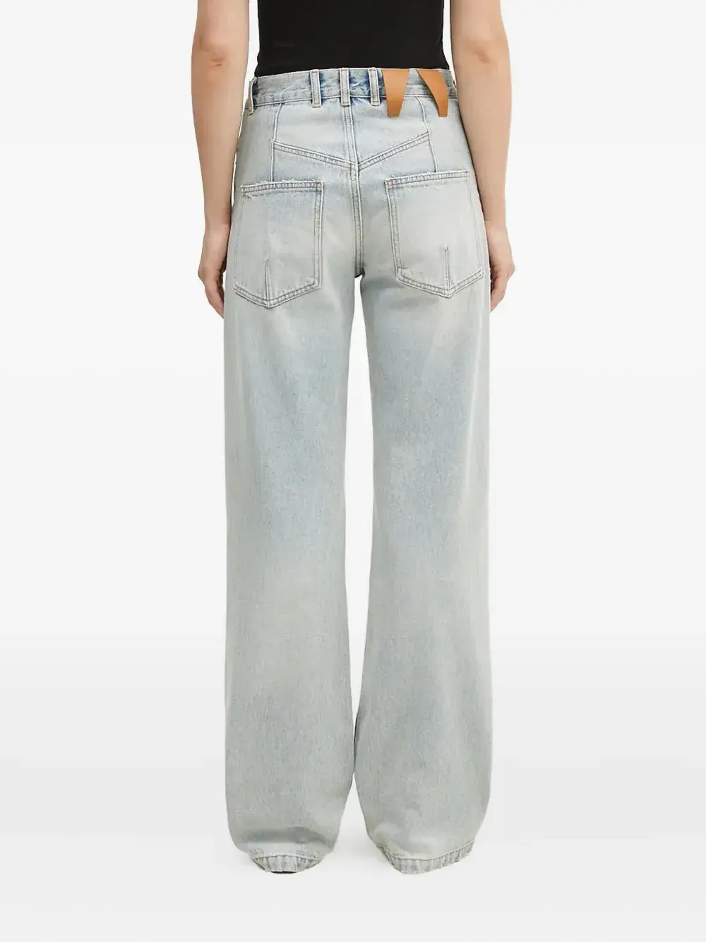 Светло-голубой цвет, панельный дизайн, шлевки для ремня, классические пять карманов, задний нашивной элемент, застежка на верхнюю пуговицу