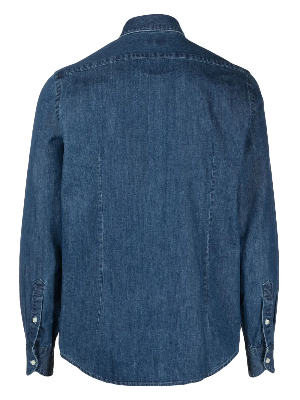 Темно-синий, хлопок, отложной воротник, застежка на пуговицах спереди, длинные рукава, рукава с манжетами на пуговицах и закругленный подол.