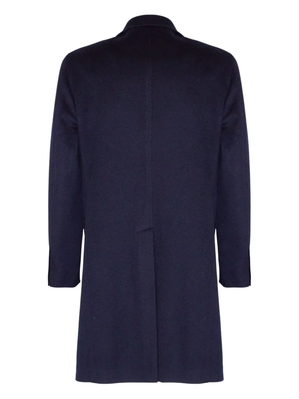 Синий двубортный пиджак с застежкой на пуговицы, лацканами с острыми концами, нагрудным прорезным карманом и фронтальными карманами с клапанами