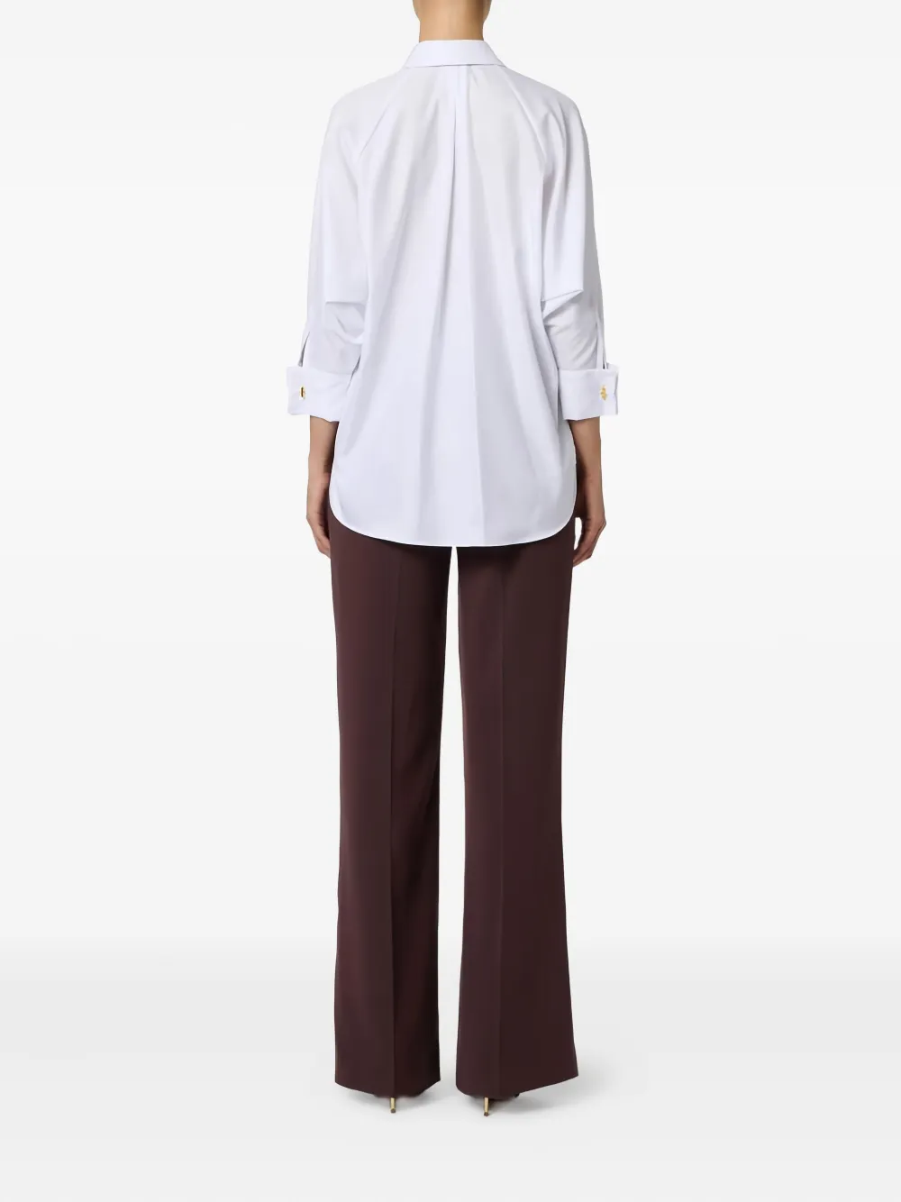 Рубашка из хлопкового поплина белого и бордового цвета, брюки из креповой ткани, двойной воротник, бабочка, ленточка с логотипом, металлические пуговицы