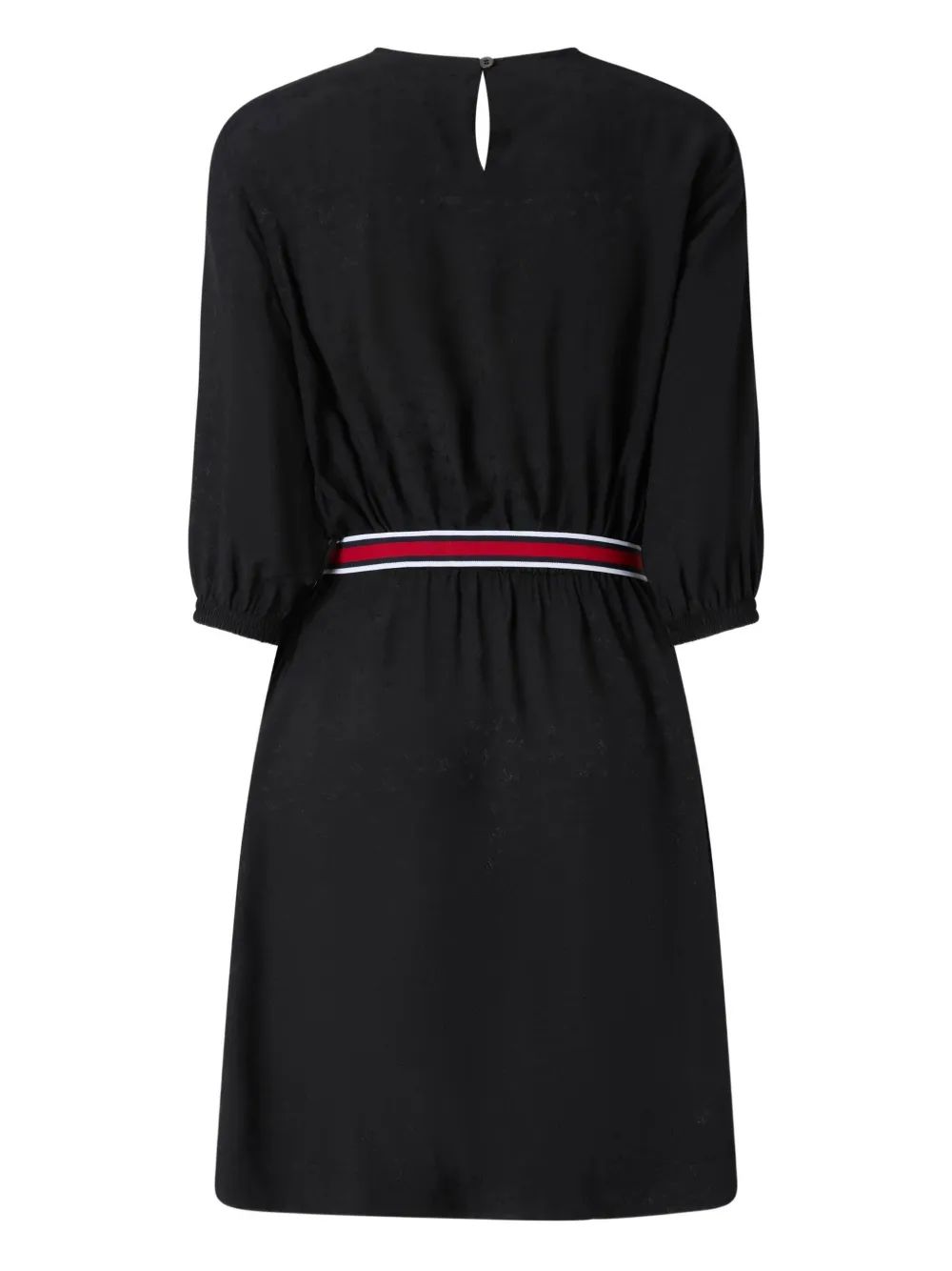 Черный круглый вырез, рукава три четверти, пряжка-ремень, застежка, деталь-капля