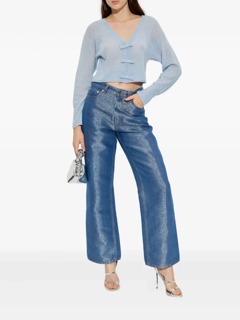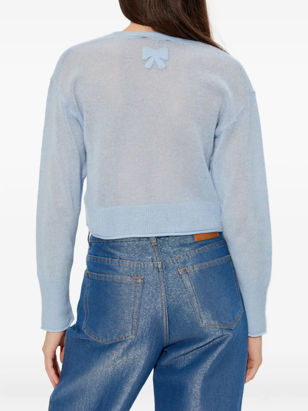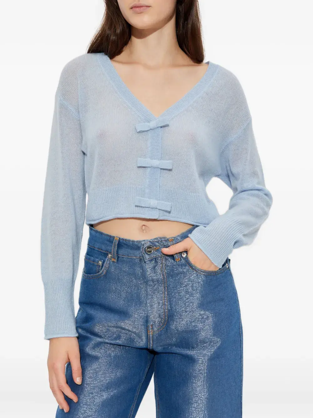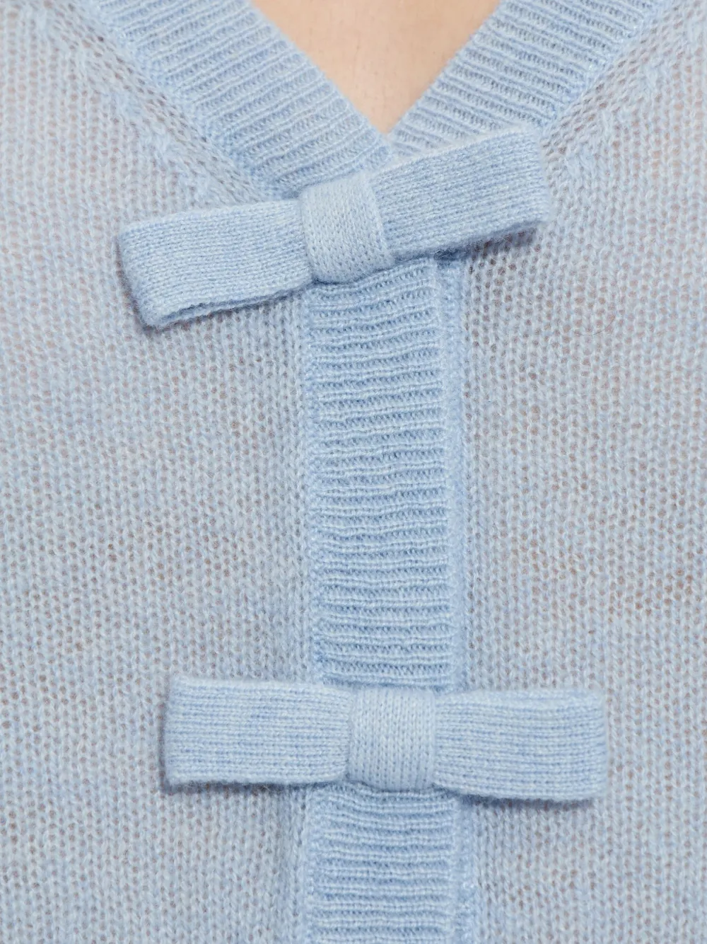 Светло-голубой джемпер с бантом, V-образным вырезом и длинными рукавами, трикотажной вязки