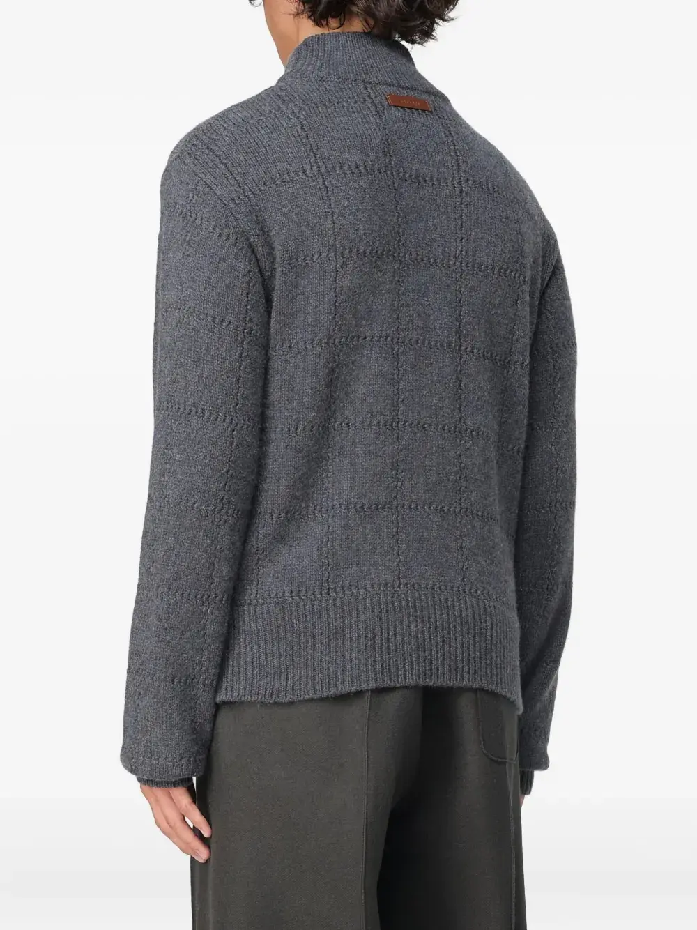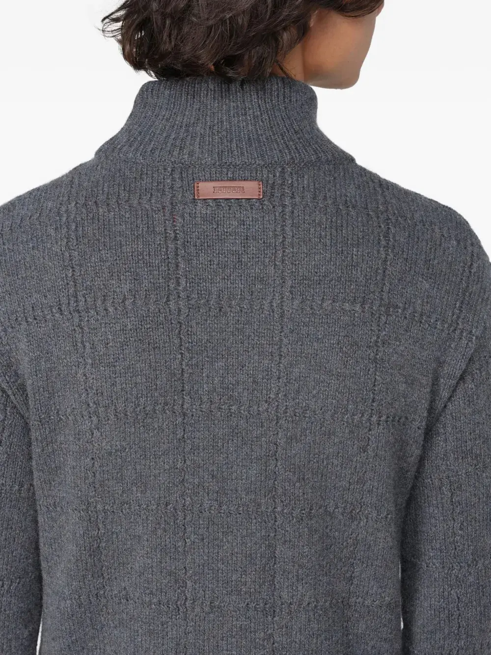 Серый с текстурированной отделкой, высокий воротник, длинные рукава, ребристый низ, нашивка сзади