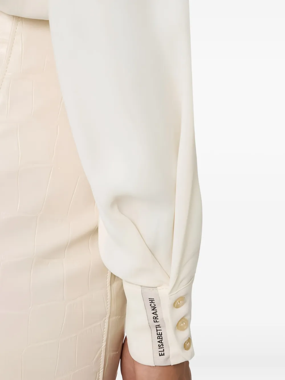 Рубашка цвета молока с воротником, длинными рукавами, манжетами на пуговицах и драпировкой спереди