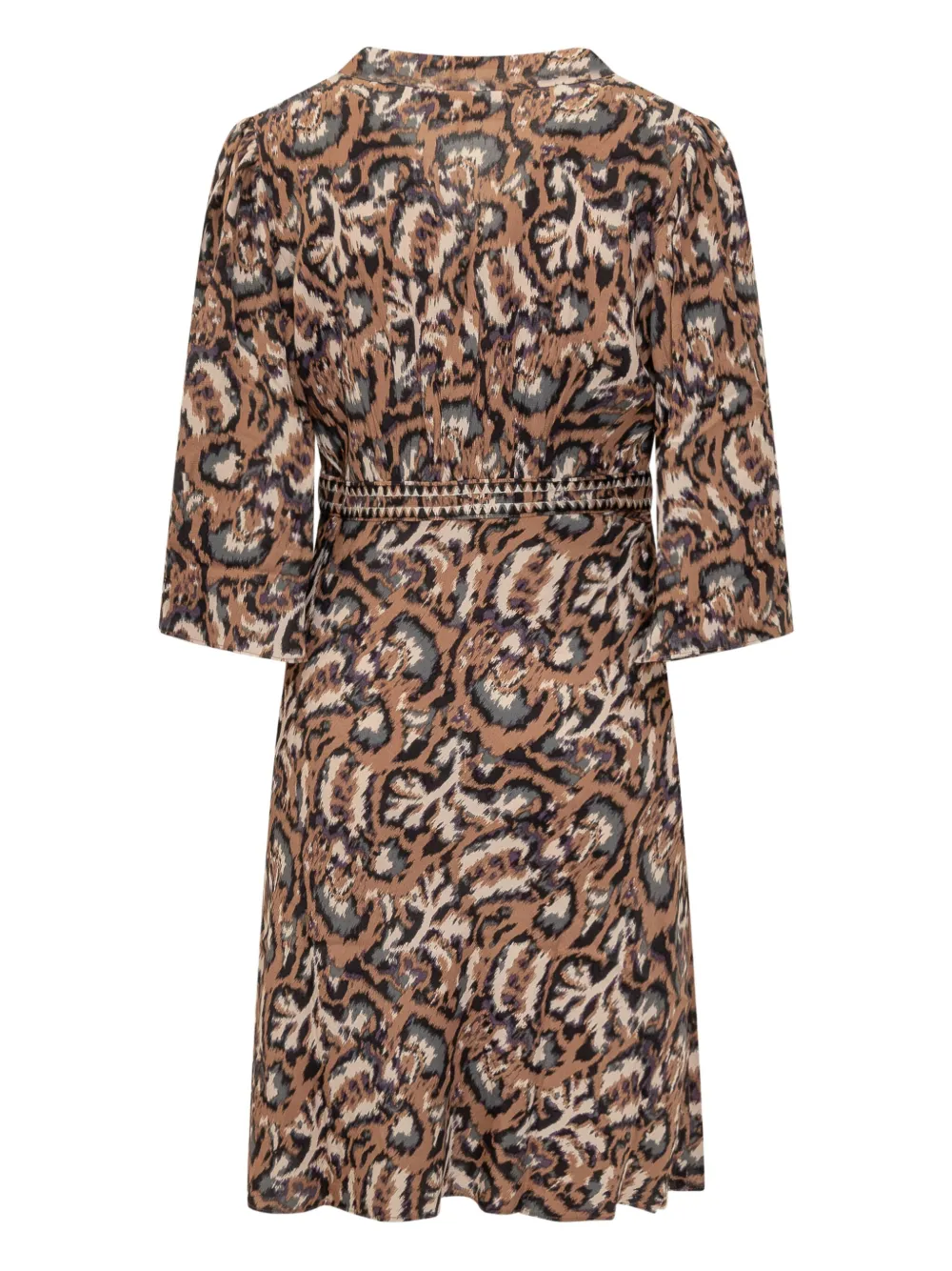 Охристое платье с узором, V-образным вырезом, рукавами три четверти, отделкой на талии и юбкой силуэта А