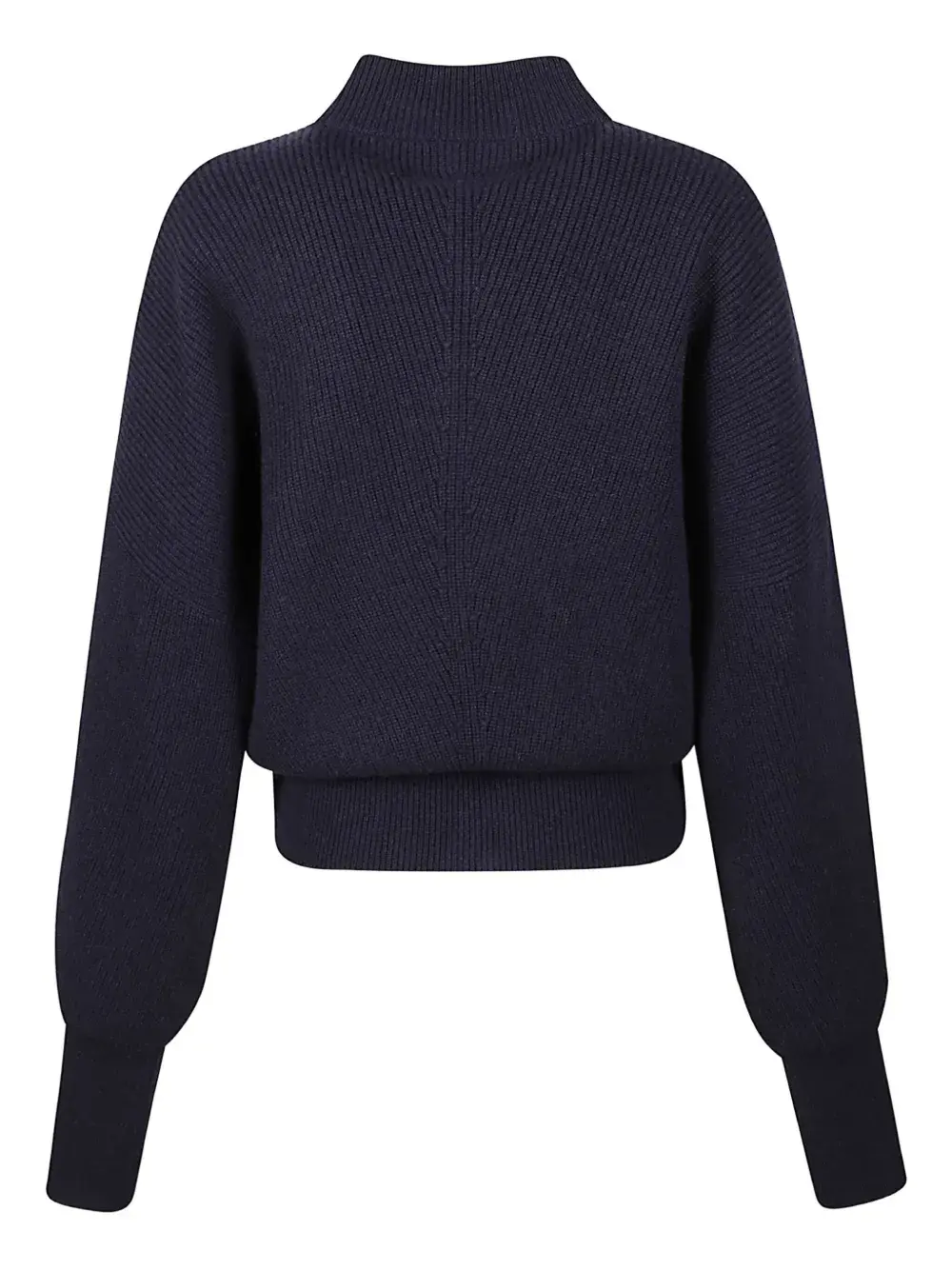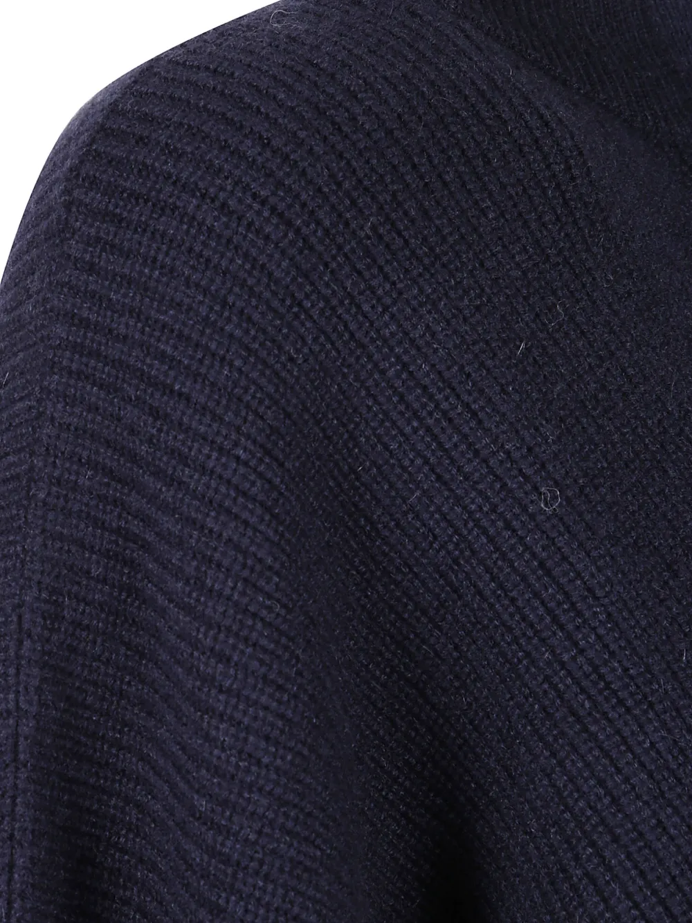 Темно-синий вязаный свитер в рубчик с высоким воротом, длинными рукавами, скрытой застежкой и эластичным низом