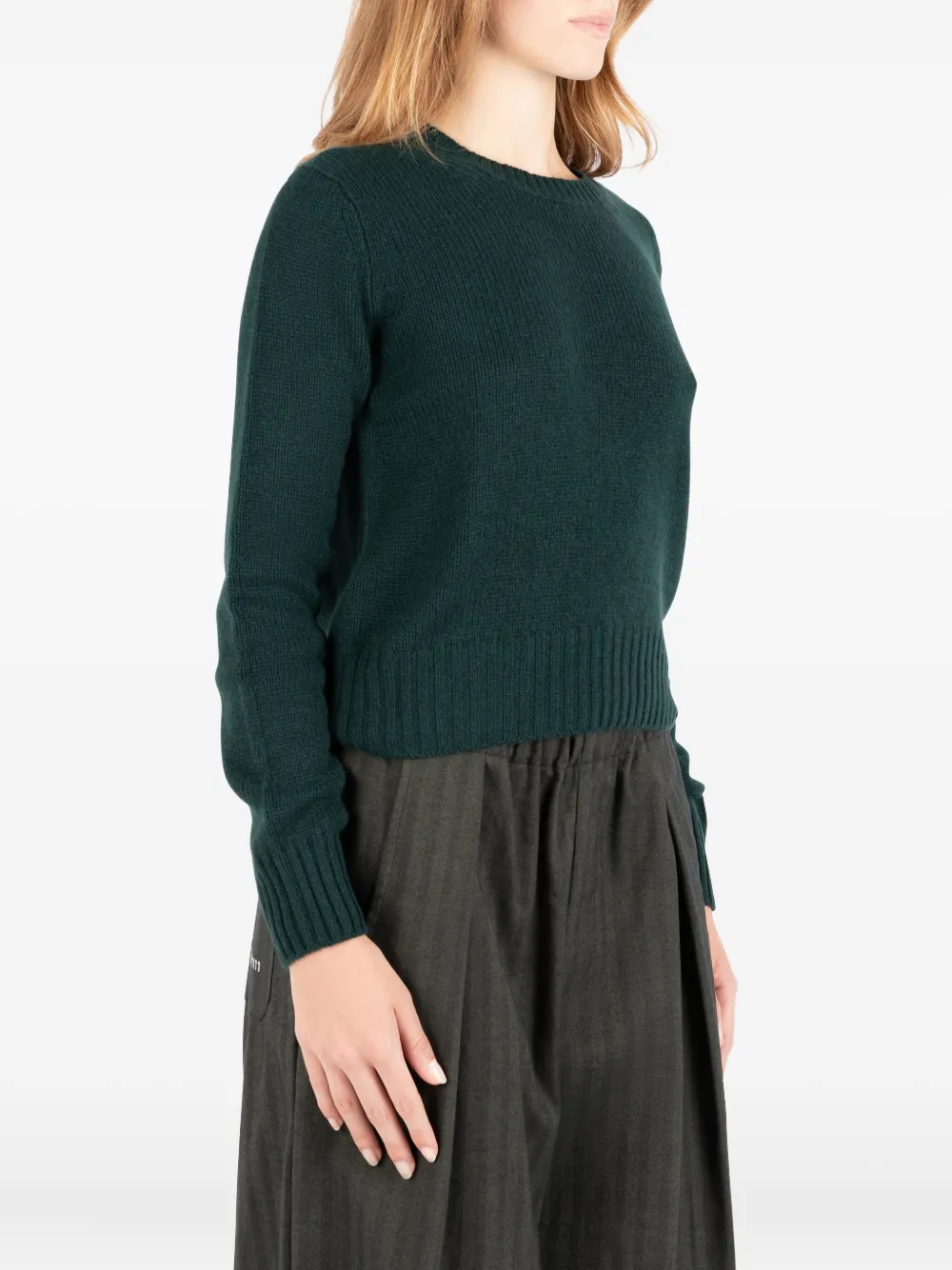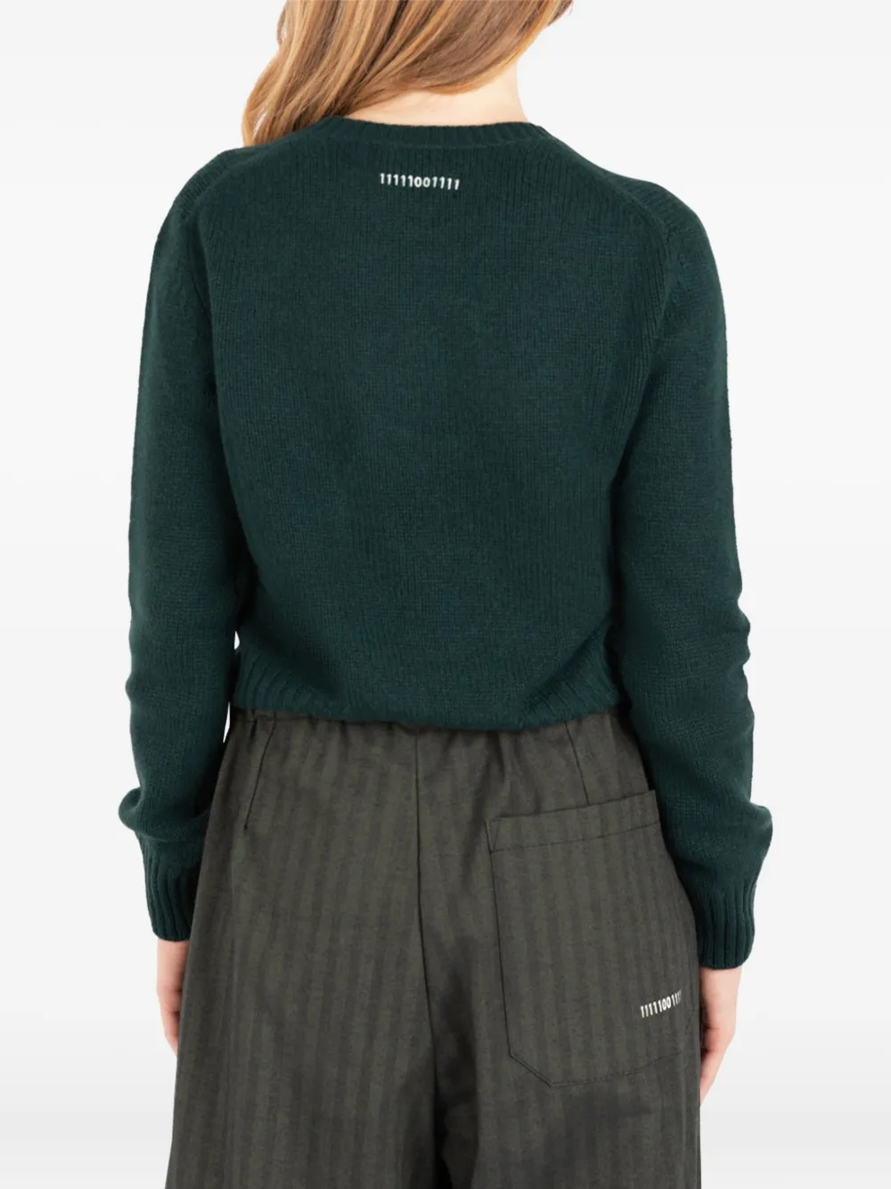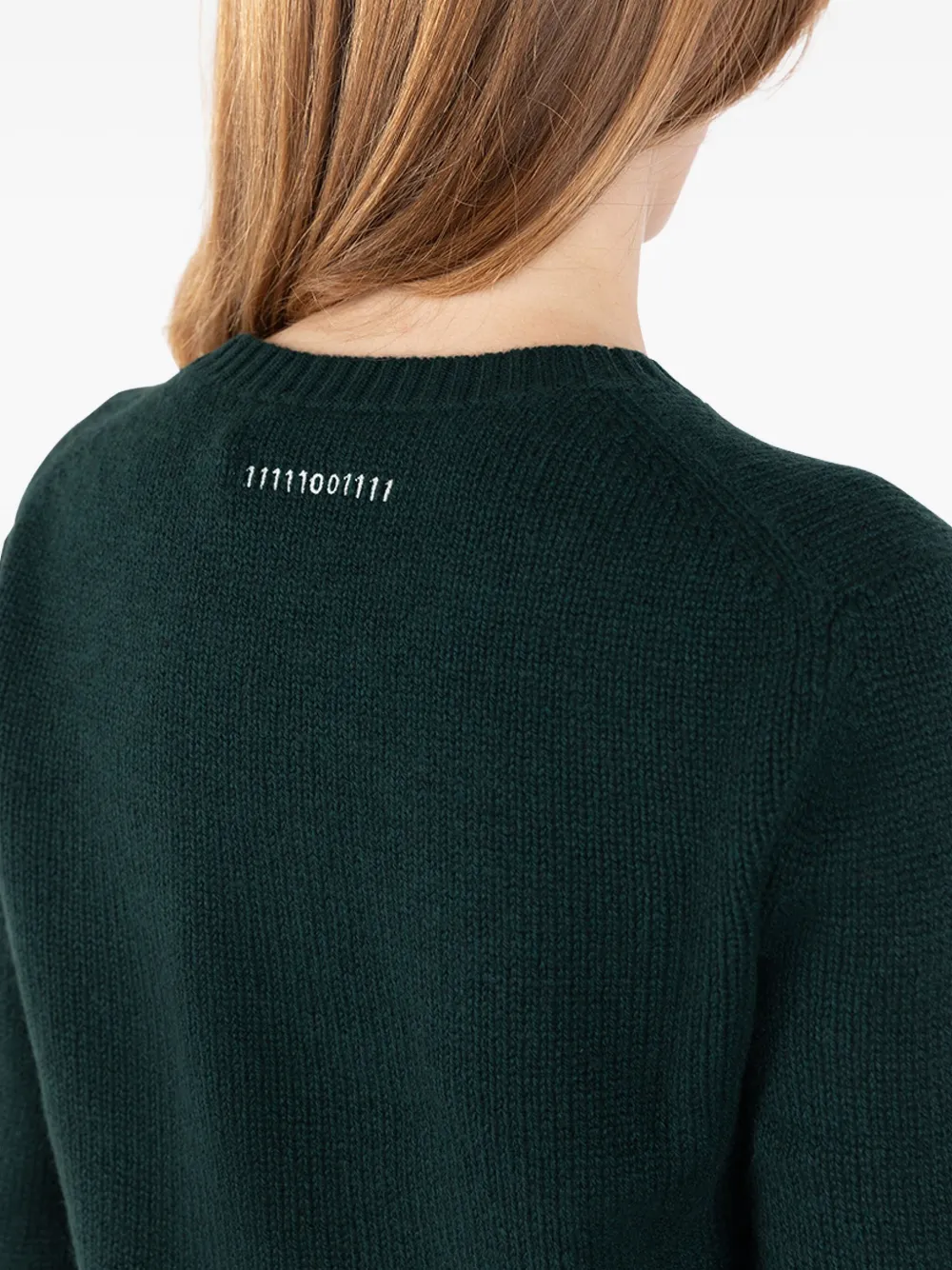 Темно-зеленый свитер с круглым вырезом, длинными рукавами, текстом на спине, рубчатой вязкой и манжетами в рубчик
