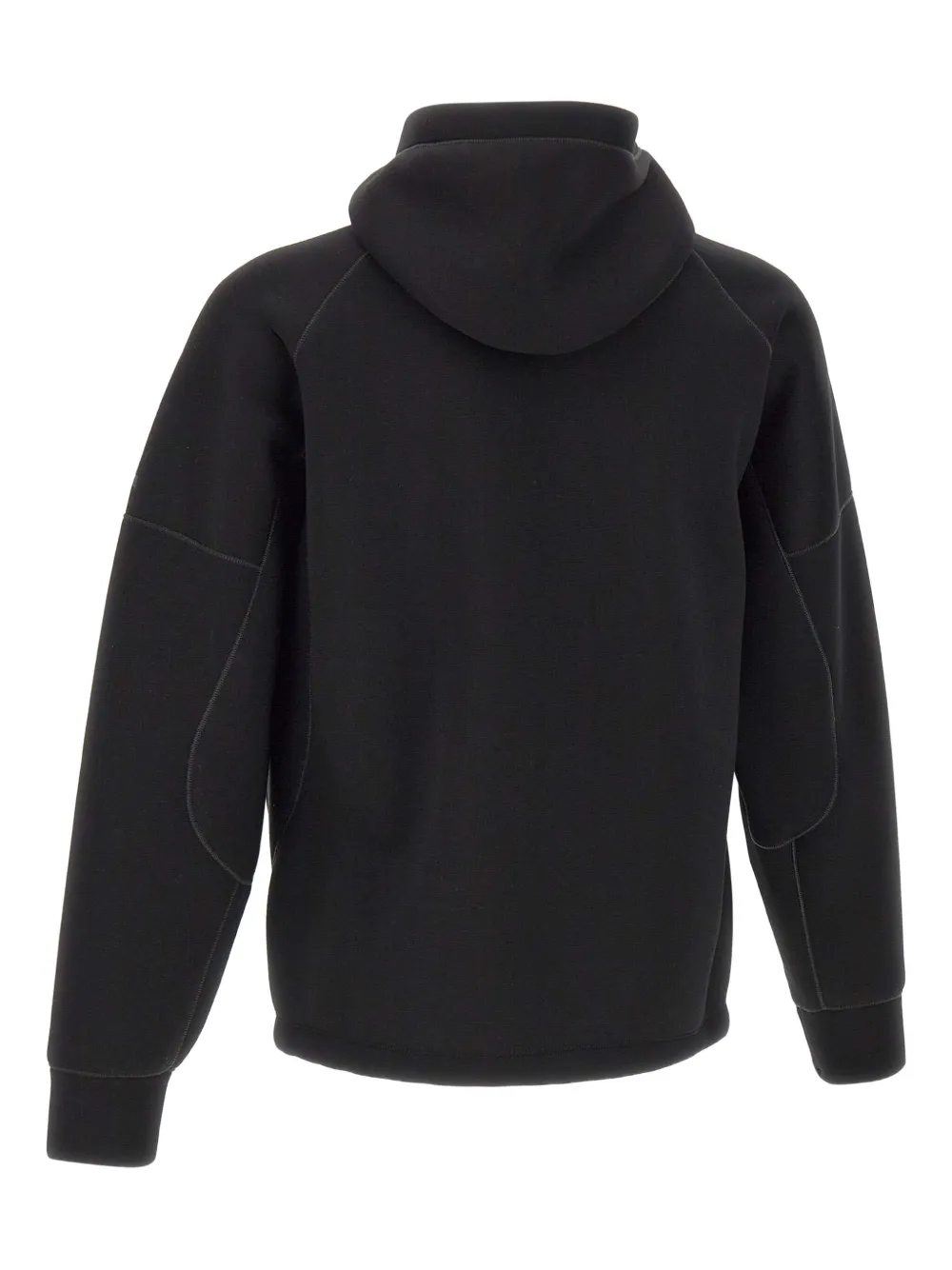 Черная регулируемая шнурком капюшон, застежка-молния спереди, прорезные карманы, логотип на рукаве, плоские манжеты