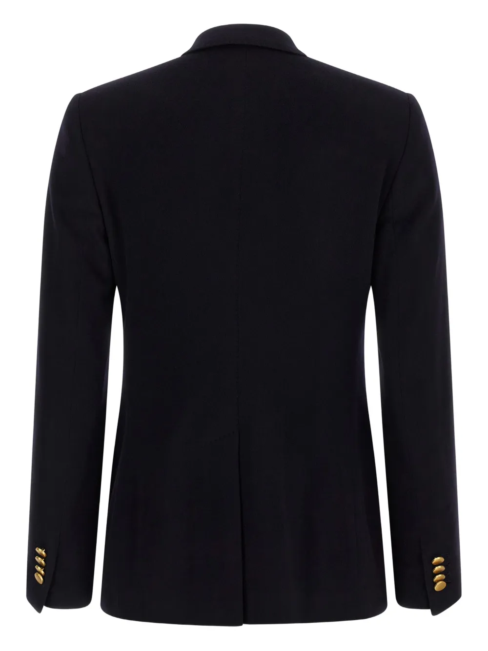 Синие пиджак на пуговицах с заостренными лацканами, клапанами на карманах, структурированными плечевыми вставками и разрезом сзади