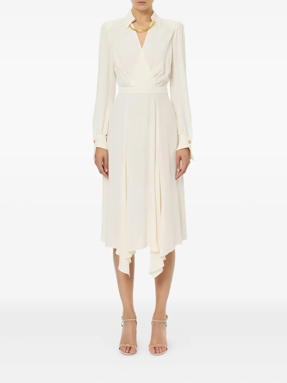 Рубашка молочно-бежевого цвета с отложным воротником, запахом и V-образным вырезом, длинными рукавами, асимметричными манжетами и съемным ожерельем