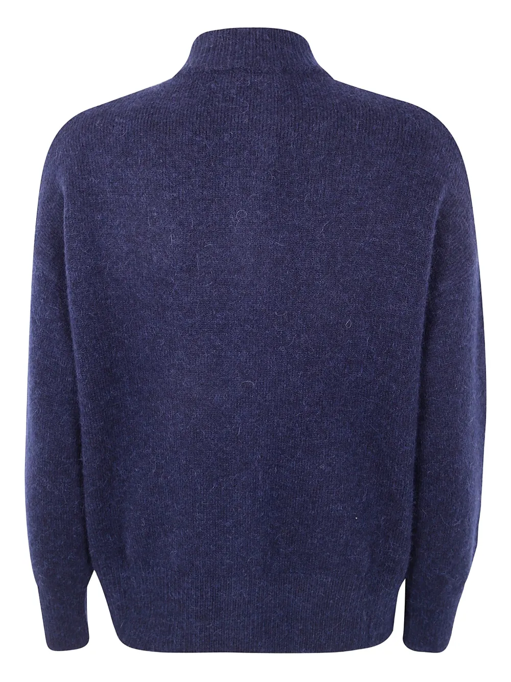 Темно-синее изделие с застежкой на пуговицы, высоким воротом, передними карманами и длинными рукавами