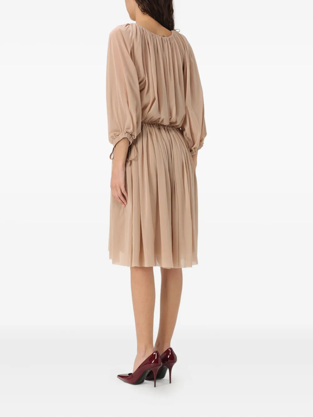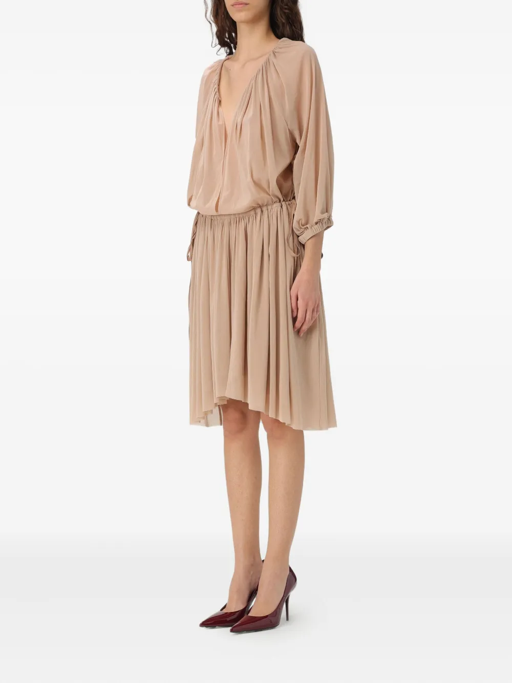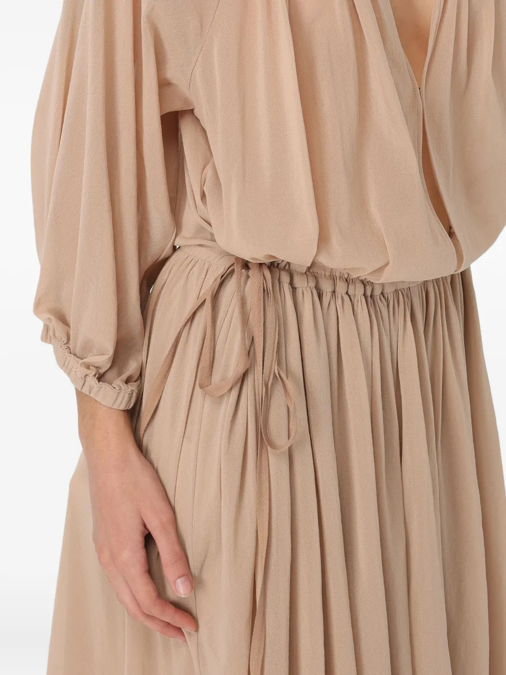 Светло-коричневое платье с драпировкой, завязками, рукавами три четверти, V-образным вырезом и плиссированной юбкой