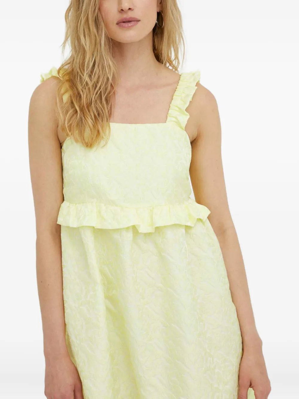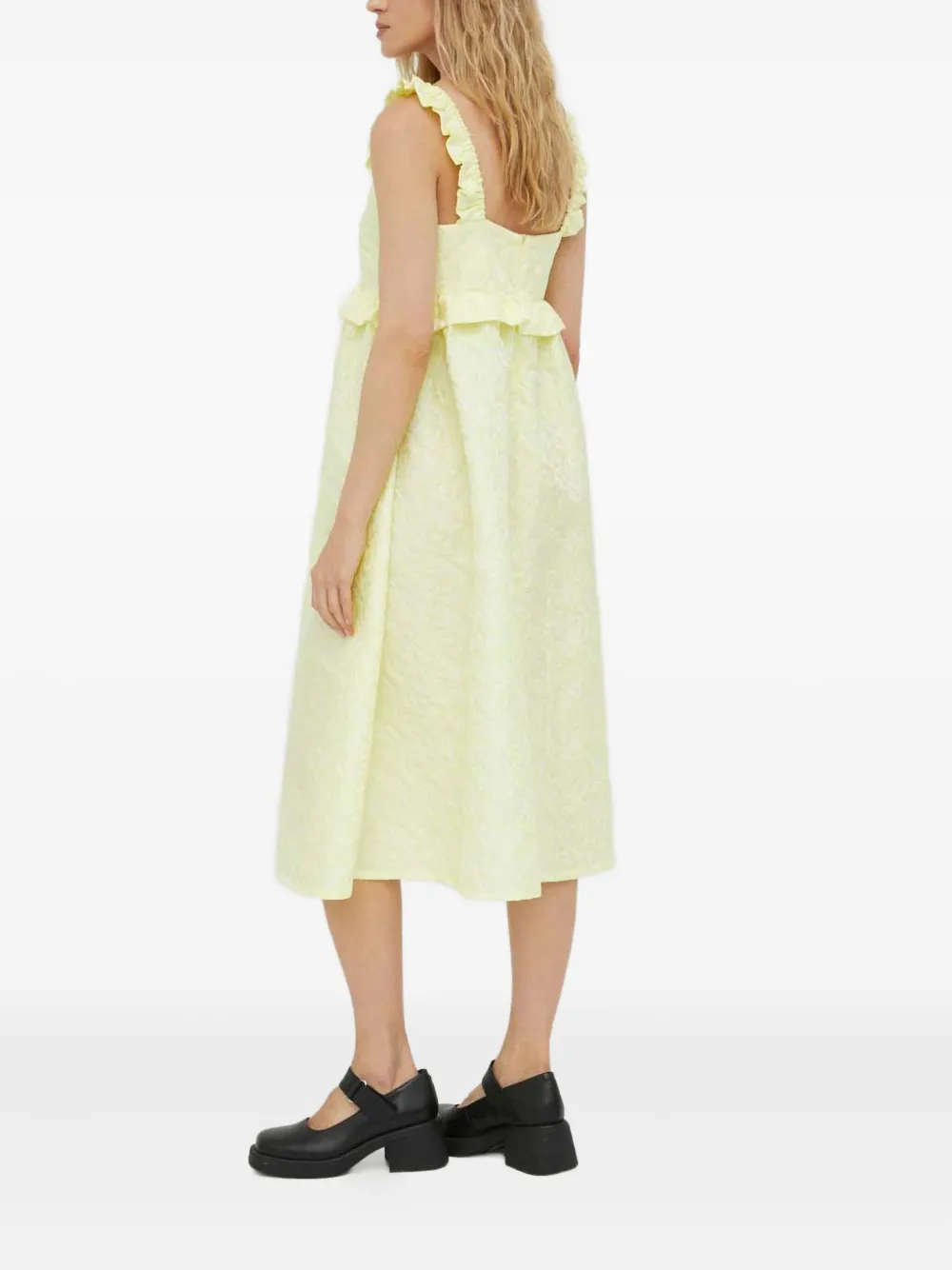 Светло-желтый жаккардовый узор, оборчатые бретели, квадратный вырез, отделка оборками, длина миди