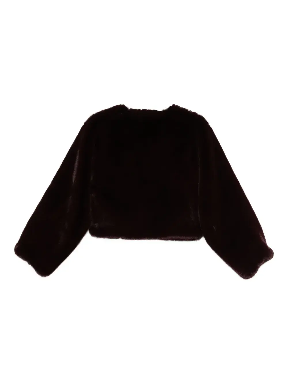 Бордовая искусственная меховая куртка с V-образным вырезом, передними карманами и длинными рукавами
