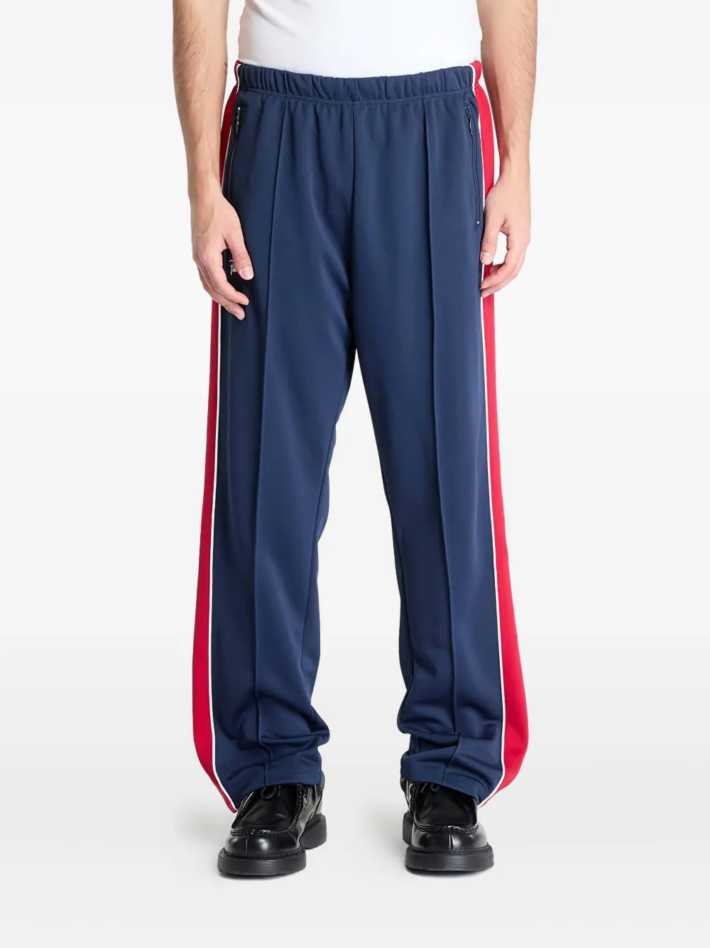 Синие брюки с боковыми полосками, молнией, эластичным поясом, задним карманом на молнии, прямые брючины