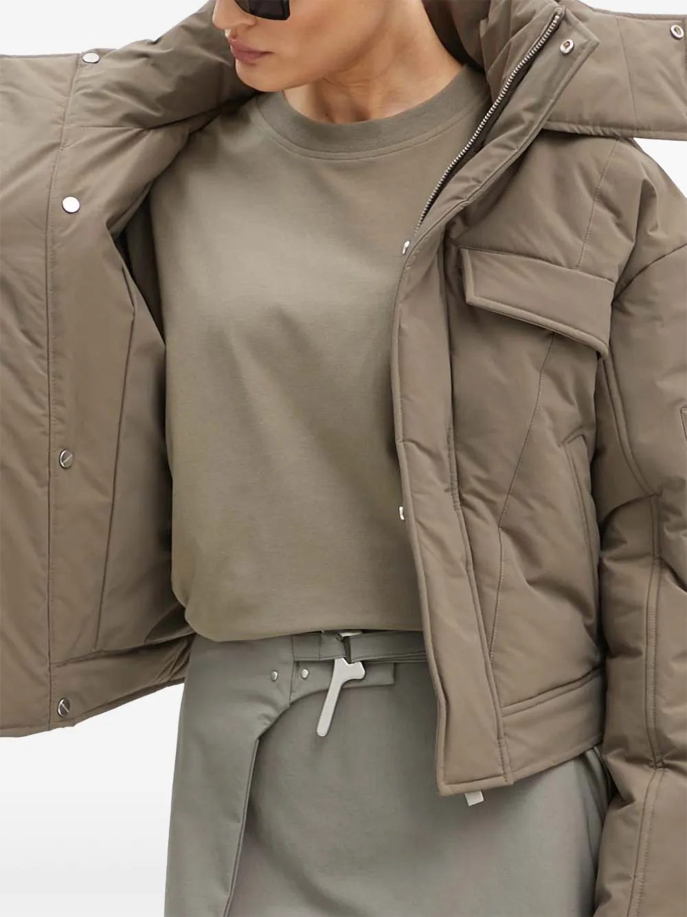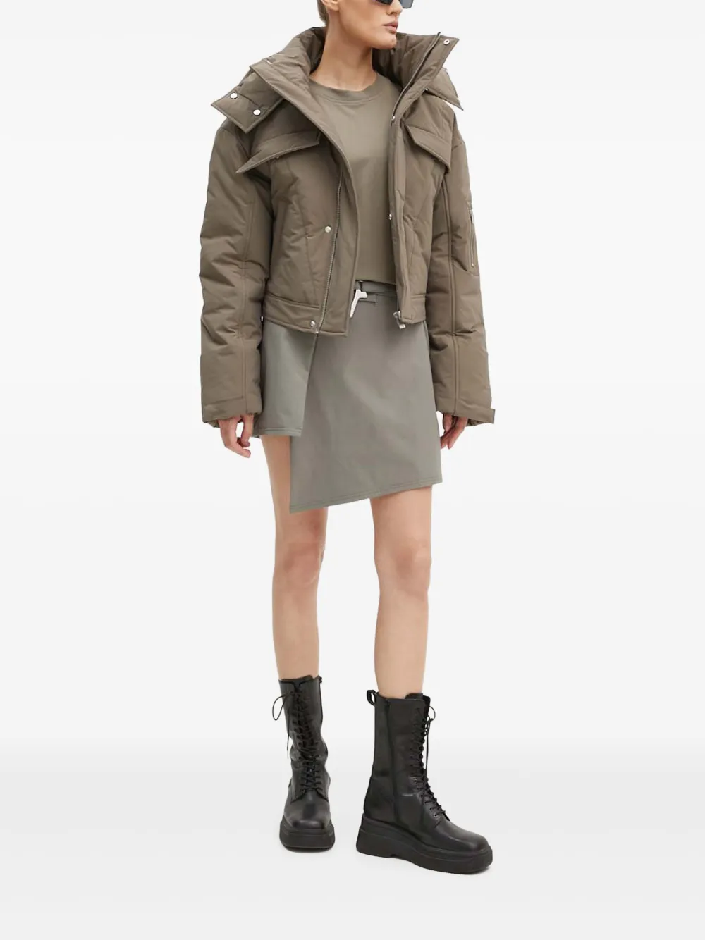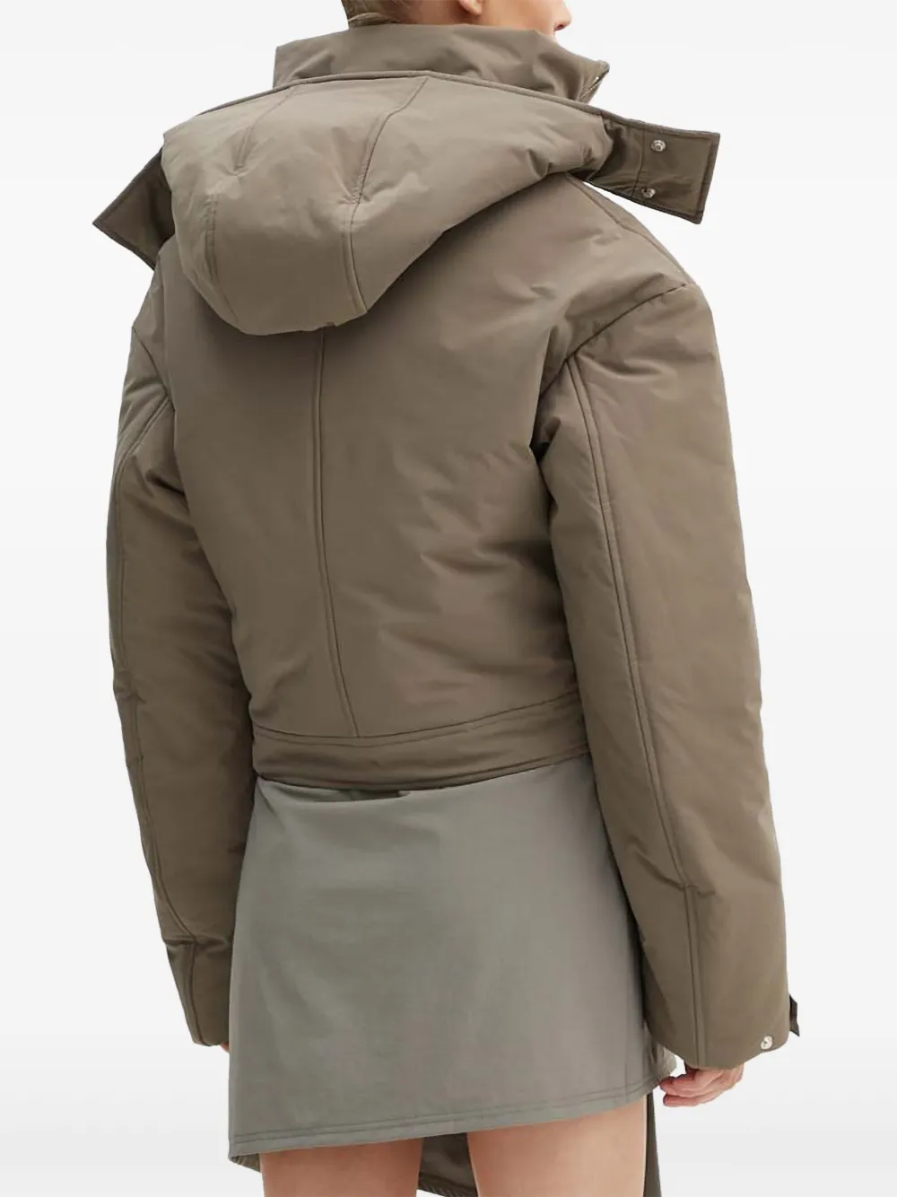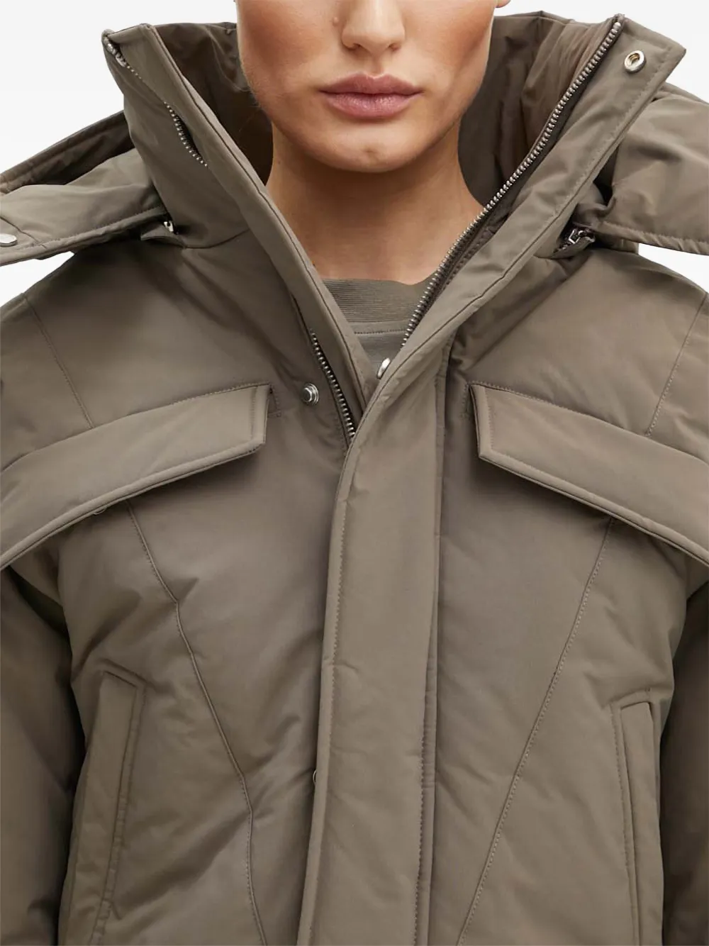 Зеленый пуховый капюшон, застежка-молния на вырезе, застежка на кнопки, передние прорезные карманы с клапанами