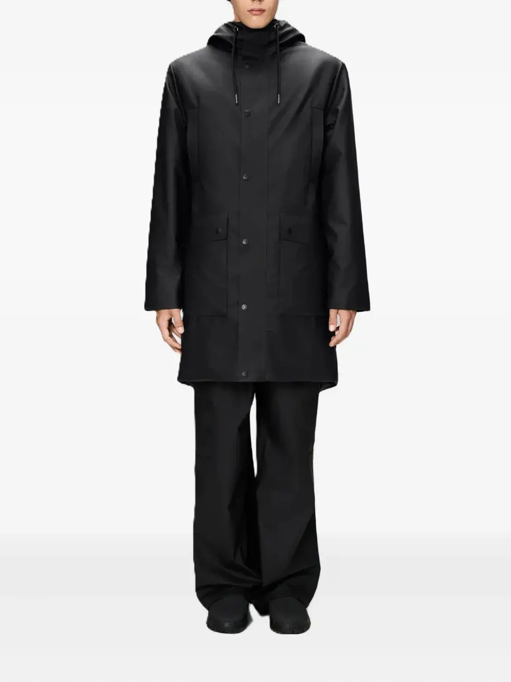 Черная куртка с капюшоном, застежкой на кнопках, кулиской по низу, накладными карманами с клапанами и длинными рукавами