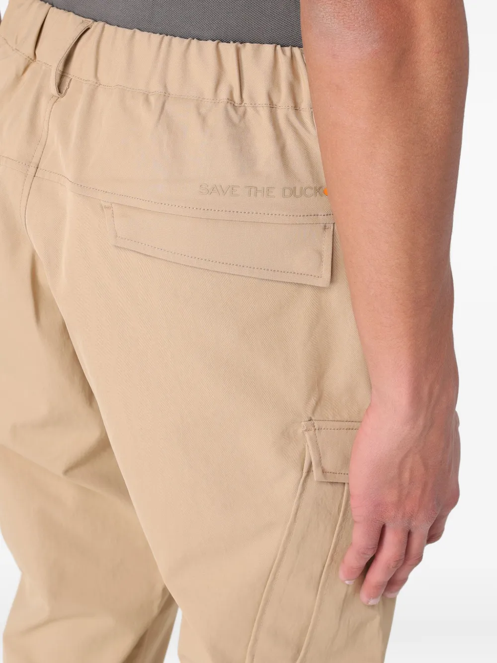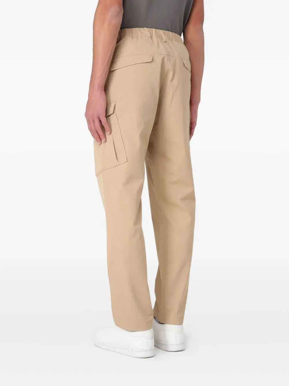 Бежевые брюки с накладными карманами, на задней части эластичный пояс, задние карманы с клапанами, застежка на пуговицу